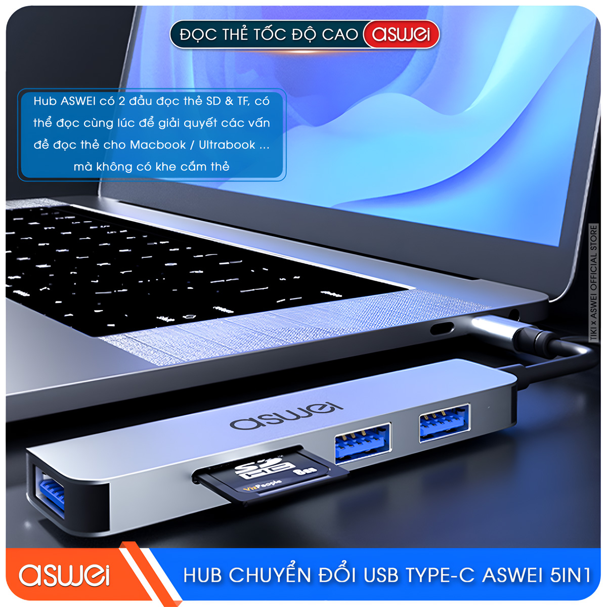 - Hub Type-C ASWEI 4in1: Đầu đọc thẻ tốc độ cao, hỗ trợ nhiều định dạng thẻ