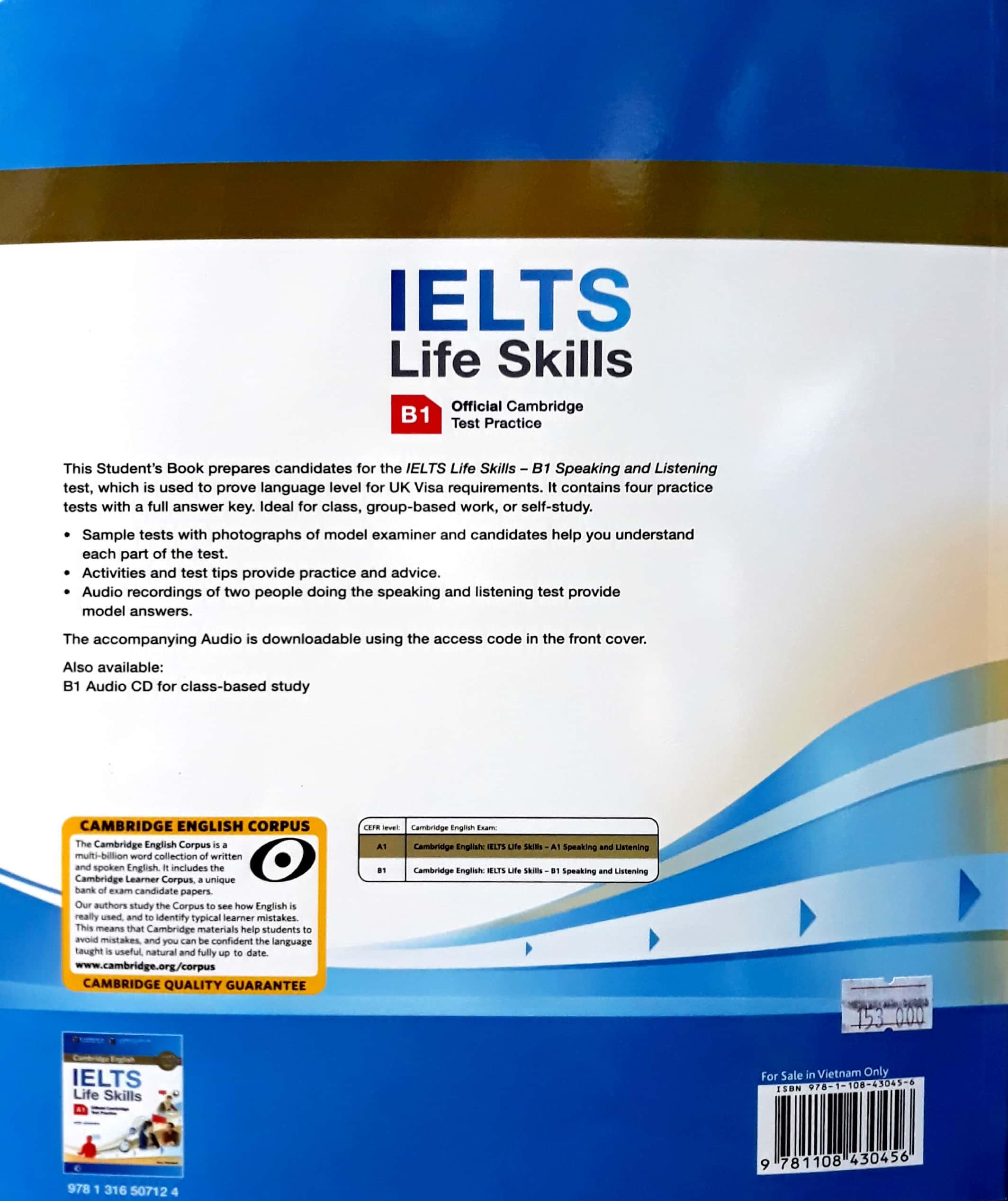 Official preparation for the 'IELTS Life Skills' Speaking and Listening exam. This Student's Book prepares candidates for the IELTS Life Skills - B1 Speaking and Listening exam which is used to prove language level for UK Visa requirements. It includes four practice tests for the exam with a full answer key. There is an introduction to the exam with information about what to expect and guidelines for teachers on how to assess students. There are model Speaking answers, practice exercises and exam tips to support candidates. The accompanying Audio is downloadable using an access code in the book. Audio CDs are also available separately for class use.Giá sản phẩm trên Tiki đã bao gồm thuế theo luật hiện hành. Bên cạnh đó, tuỳ vào loại sản phẩm, hình thức và địa chỉ giao hàng mà có thể phát sinh thêm chi phí khác như phí vận chuyển, phụ phí hàng cồng kềnh, thuế nhập khẩu (đối với đơn hàng giao từ nước ngoài có giá trị trên 1 triệu đồng).....