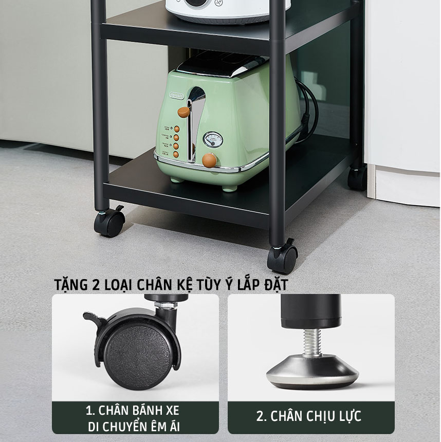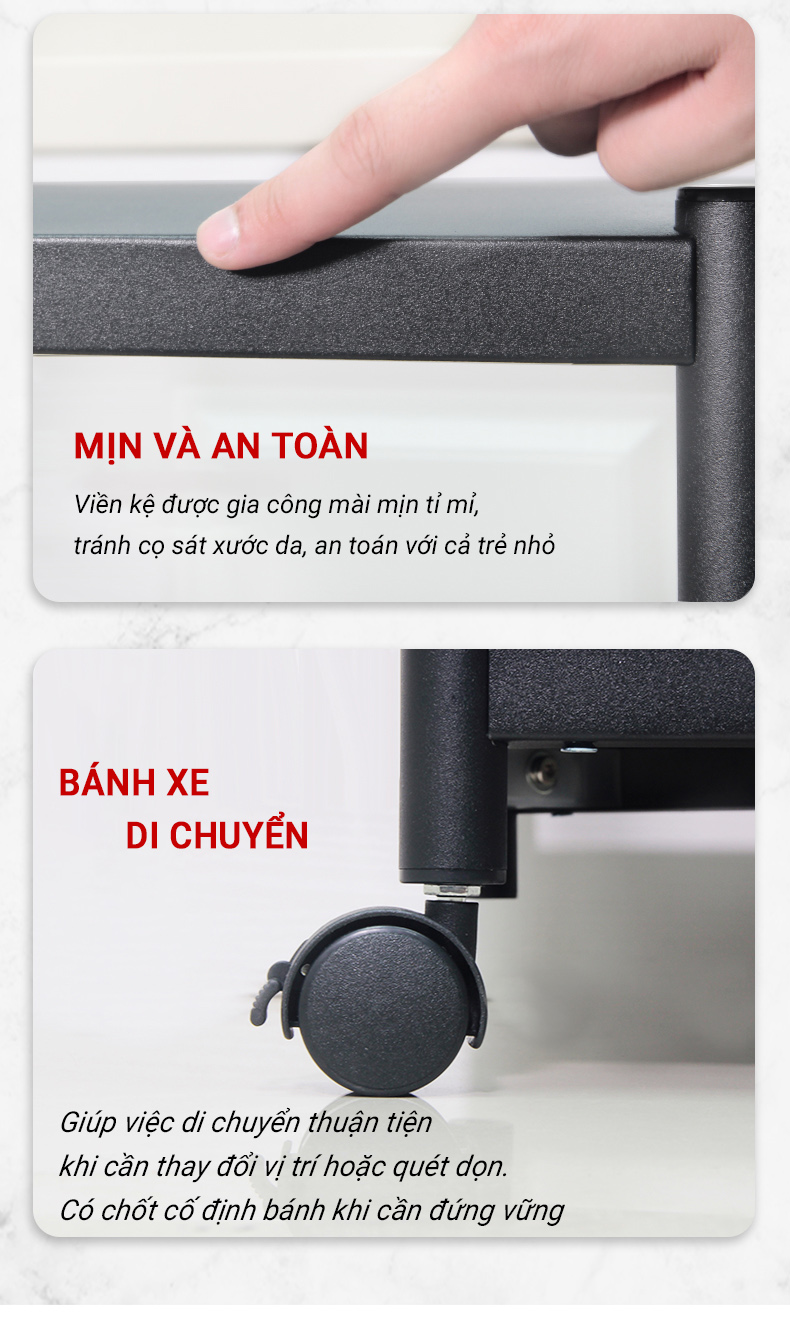 - 4 bánh xe : chân kệ để di chuyển êm ái nhẹ nhàng, khóa chốt khi cần đứng yên.