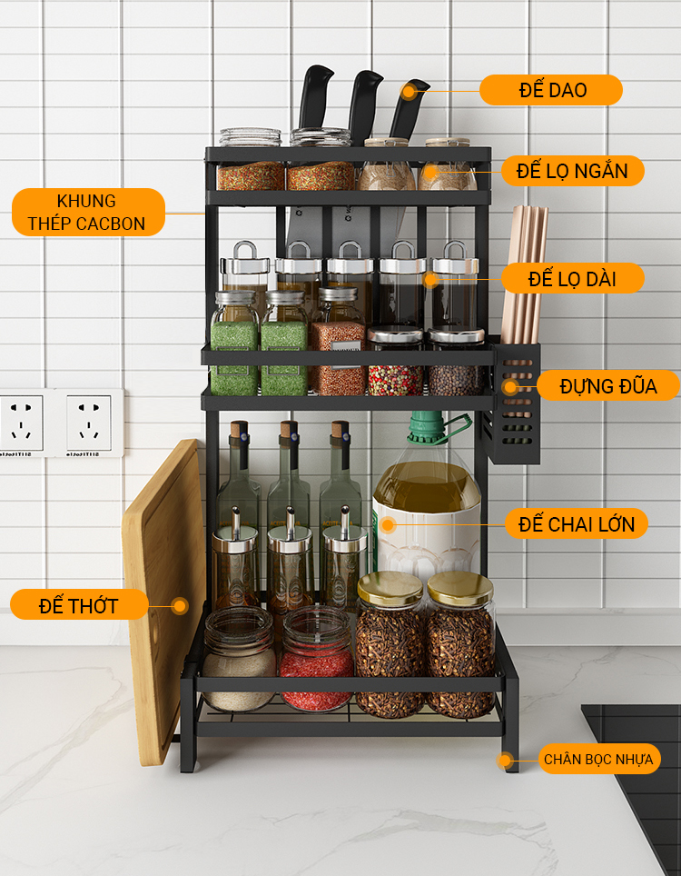 Thông số kỹ thuật Kệ gia vị chữ E cao cấp VANDO bằng thép carbon chống gỉ, chống xước, kệ đựng chai lọ gia vị đa năng, kệ để đồ nhà bếp gọn gàng, sang trọng