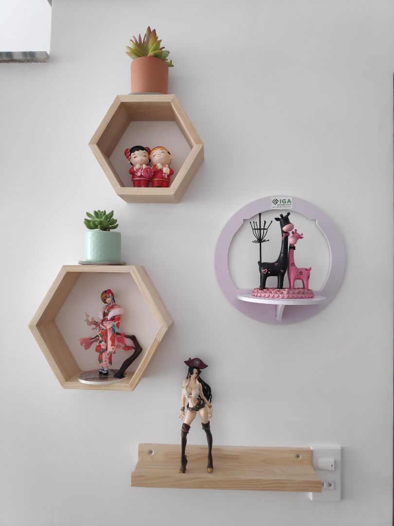- Kệ gỗ dùng để trang trí, để các đồ lưu niệm, tranh, ảnh, phụ kiện trong các phòng ngủ, phòng khách