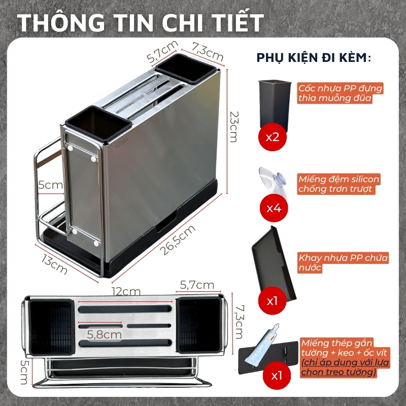 Thông số kỹ thuật Kệ inox 304 DandiHome đựng dao thớt, đũa đa năng trong nhà bếp