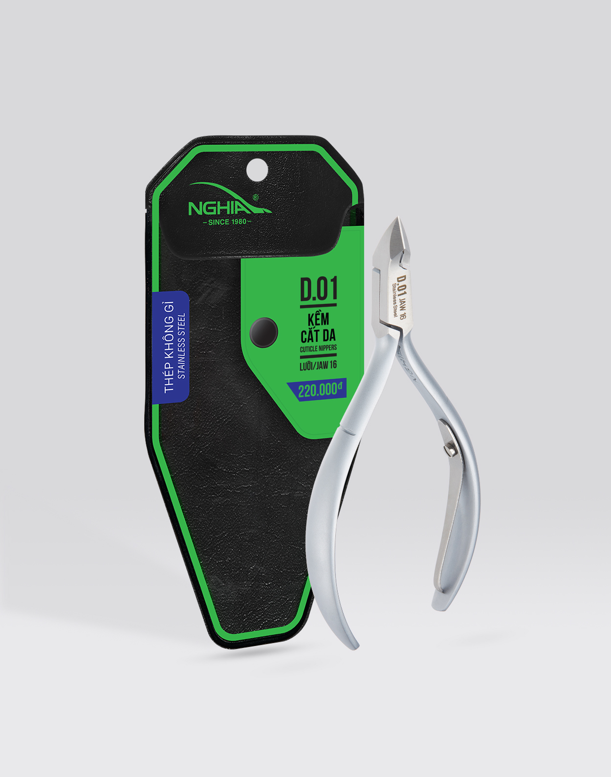 - Kềm Cắt Da Thép Không Gỉ Kềm Nghĩa D-01(16) có thiết kế kiểu dáng phù hợp với bàn tay người Châu Á.