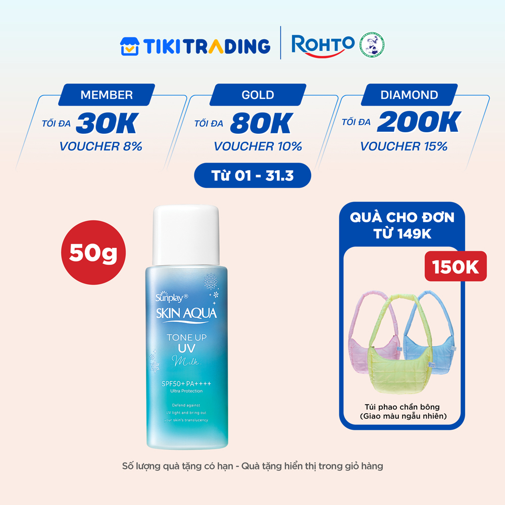 Thông số kỹ thuật Kem chống nắng nâng tông Skin Aqua Tone up Blue cho da vàng có khuyết điểm đỏ, dạng sữa Sunplay Skin Aqua Tone Up UV Milk Blue SPF 50+ PA++++ 50g