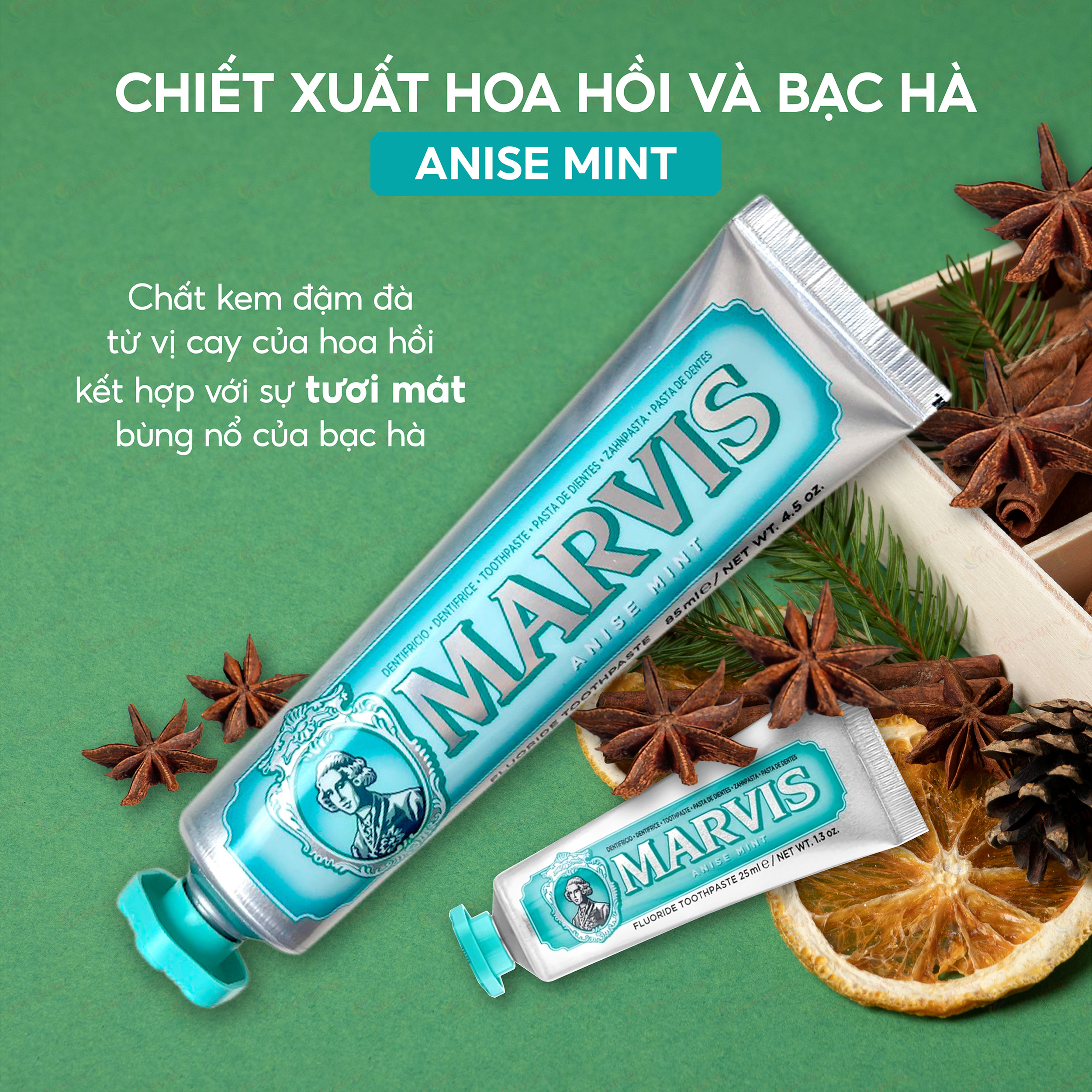 - Annise Mint ( Xanh Lá): hương bạc hà và sao hồi cay the tạo ra sự bùng cháy mới lại, chuyên khử mùi sau khi ăn những thực phẩm có mùi nặng như mắm, ốc, hải sản,