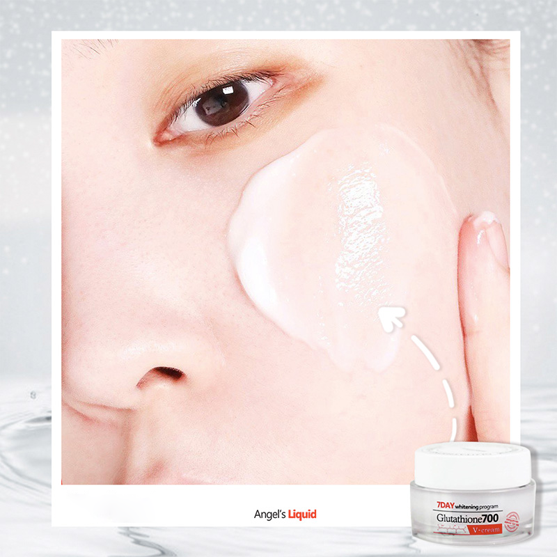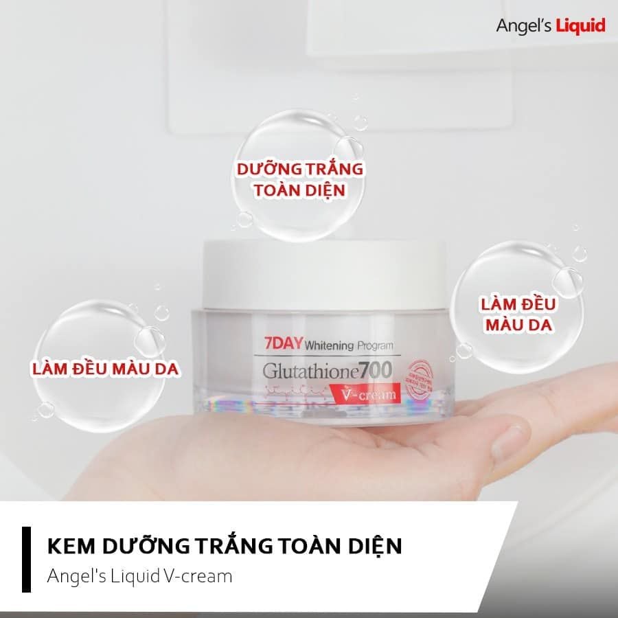Kem dưỡng trắng, cấp ẩm đa tầng Angel's Liquid 7 DAY Whitening Program Glutathione 700 V-cream 50ml là dòng sản phẩm có chứa nano L-Glutathione dưỡng da trắng sáng, xóa mờ thâm, sạm nám, làm đều màu da, tăng cường chống oxy hóa. Kết hợp Niacinamide & Sodium Hyaluronate (HA) thu nhỏ lỗ chân lông, kiểm soát tình trạng dầu mụn, tăng sinh collagen & elastin giúp chống lão hóa, đồng thời cấp ẩm sâu giúp da căng bóng chuẩn Hàn. Hiệu quả sau 7 ngày sử dụng đã được kiểm chứng bởi viện nghiên cứu da Hàn Quốc.