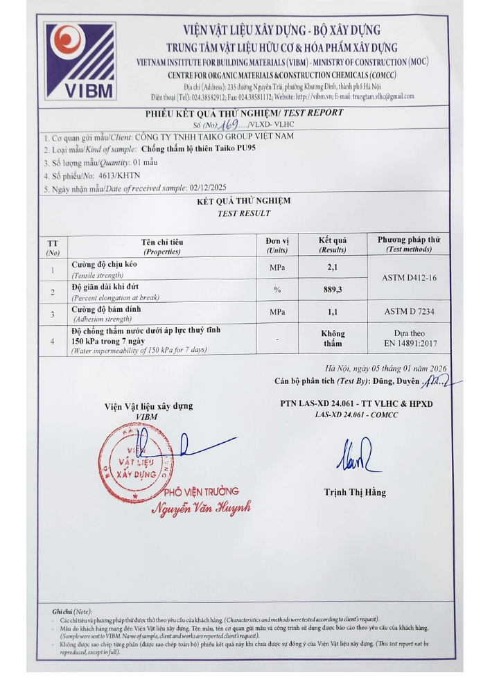 Thông số kỹ thuật [1 Kg] Sơn Chống Thấm PU (Polyurethane) TAIKOMI PU95 - Chống Thấm Sàn Lộ Thiên Đã Ốp Lát Đi Lại Nhiều