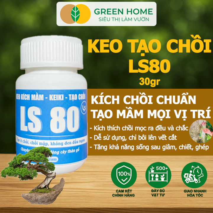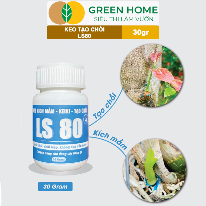 -Keo tạo chồi, kích keiki, kích mầm LS 80 là dòng keo chuyên dùng để tạo nhánh. Keo tạo chồi LS 80 tạo được các vị trí không cần mắt ngủ trên các cây thân gỗ. Ngoài ra keo kích chồi ls 80 cũng đánh thức các mắt ngủ trên hoa hồng và hoa lan cực nhanh chỉ sau vài ngày bôi.