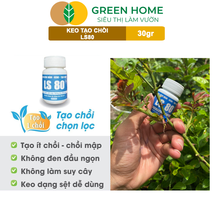 Thông số kỹ thuật Keo Tạo Chồi LS80, Greenhome, Hũ 30gr, Tạo Mầm Tại Vị Trí Bất Kỳ, Có Chọn Lọc, Không Suy Cây, Đen Chồi