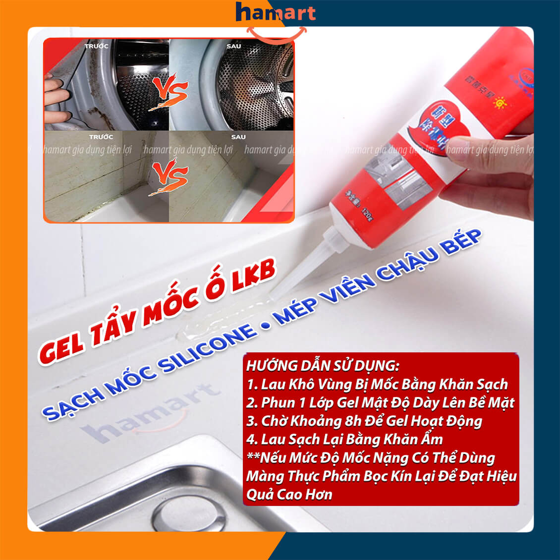 - Gel tẩy nấm mốc silicone, gioăng cửa máy giặt, mép tường, viền bếp, kính, gỗ, men, inox, thạch