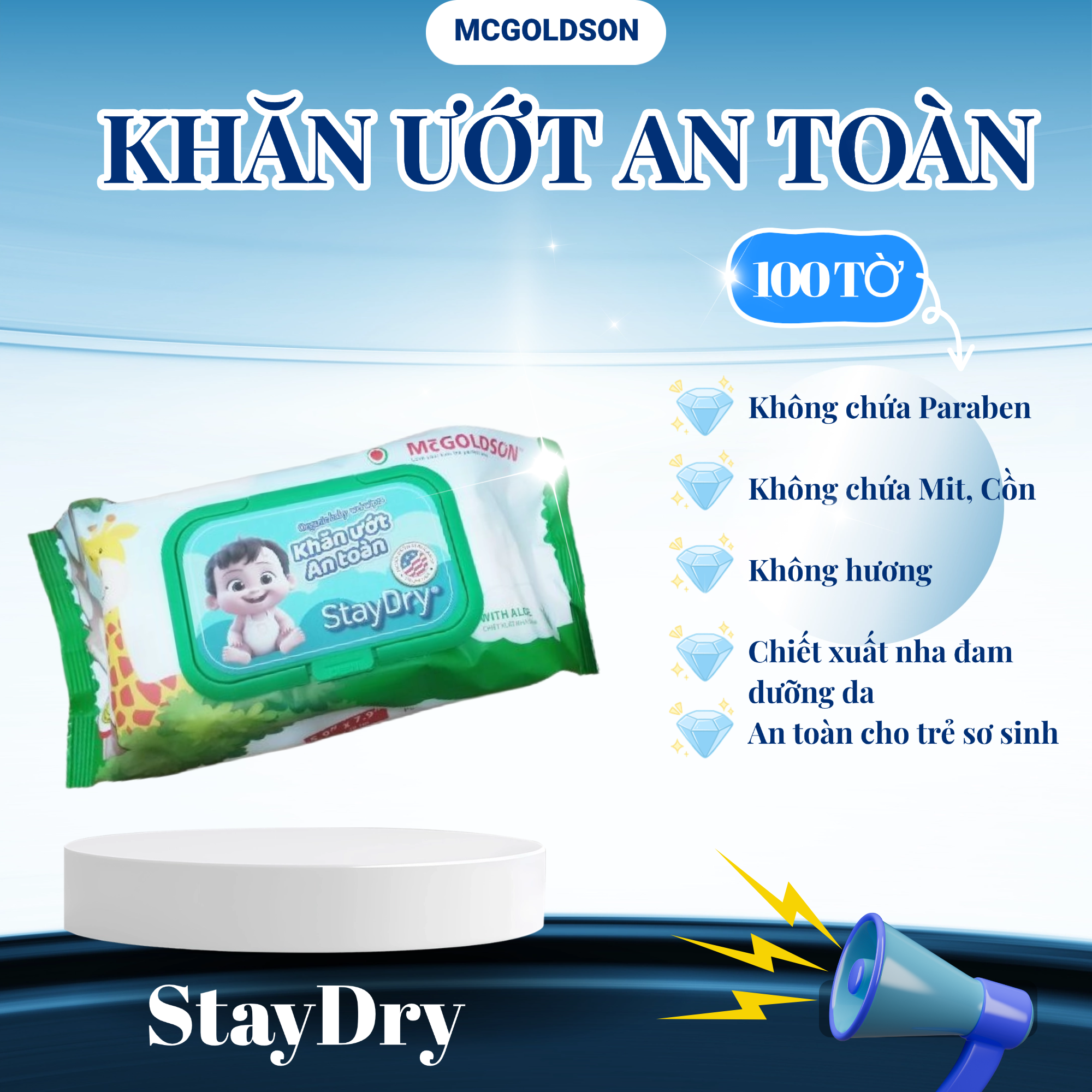 - Ngoài ra khăn giấy ướt Staydry còn có khả năng kháng một số loại vi khuẩn. Được sản xuất theo tiêu chuẩn của Mỹ, đảm bảo an toàn cho cả gia đình.