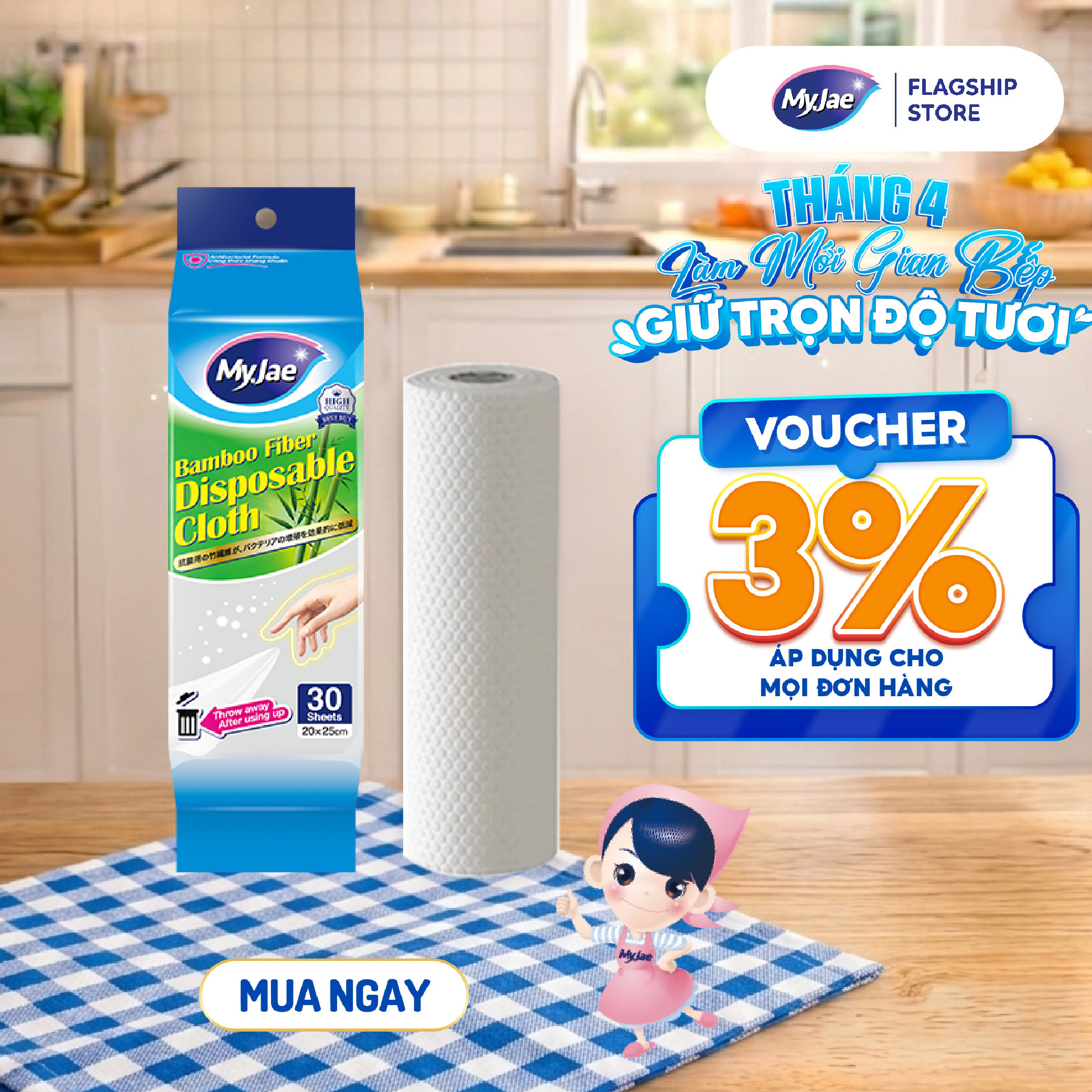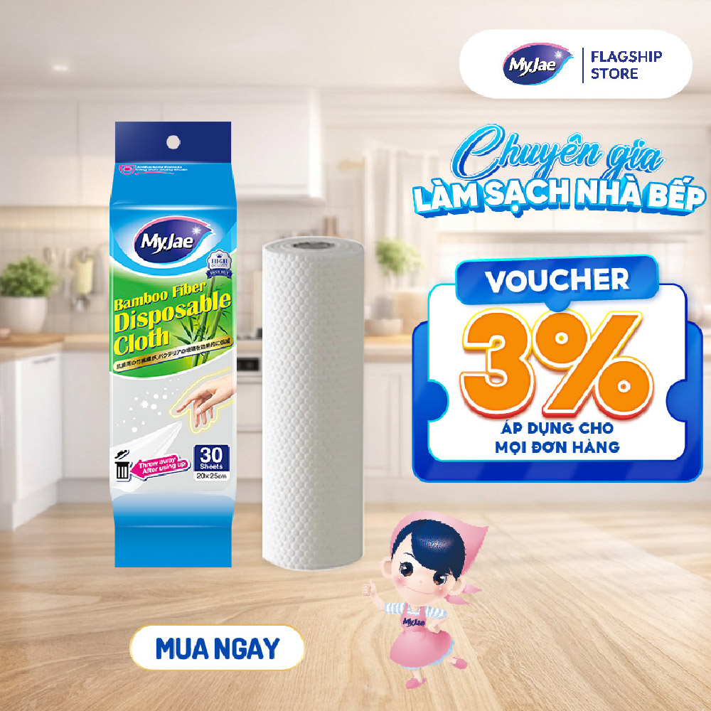 Thông số kỹ thuật Khăn Lau Sợi Tre MyJae Một Lần Dùng Lau Bề Mặt, Đánh Bay Dầu Mỡ 20cm x 25cm (30 Cái/Bịch)