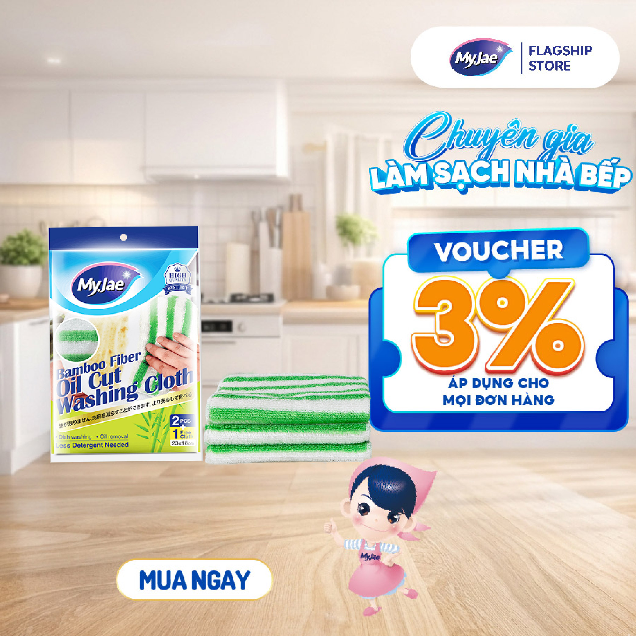 Thông số kỹ thuật Khăn lau sợi tre MyJae lau bếp, lau tay, 2 mặt có móc treo 23cm x 18cm (3 Cái/Gói)