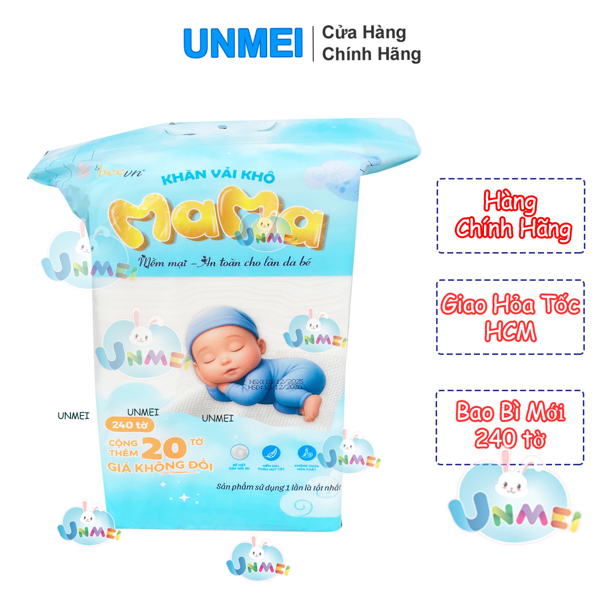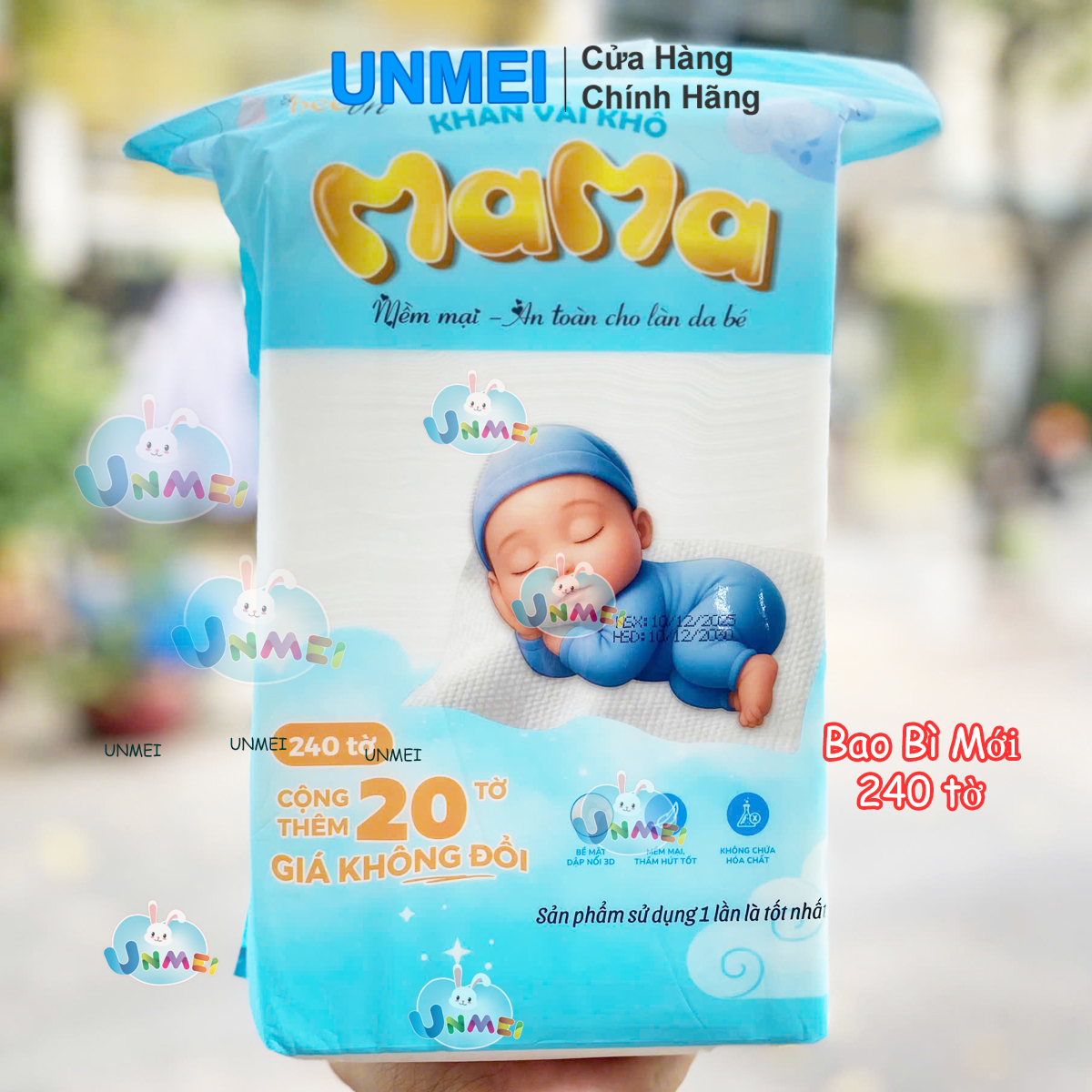 - Khăn khô Mama hoàn toàn không mùi hương, thân thiện với làn da và cảm giác của bé khi sử dụng.