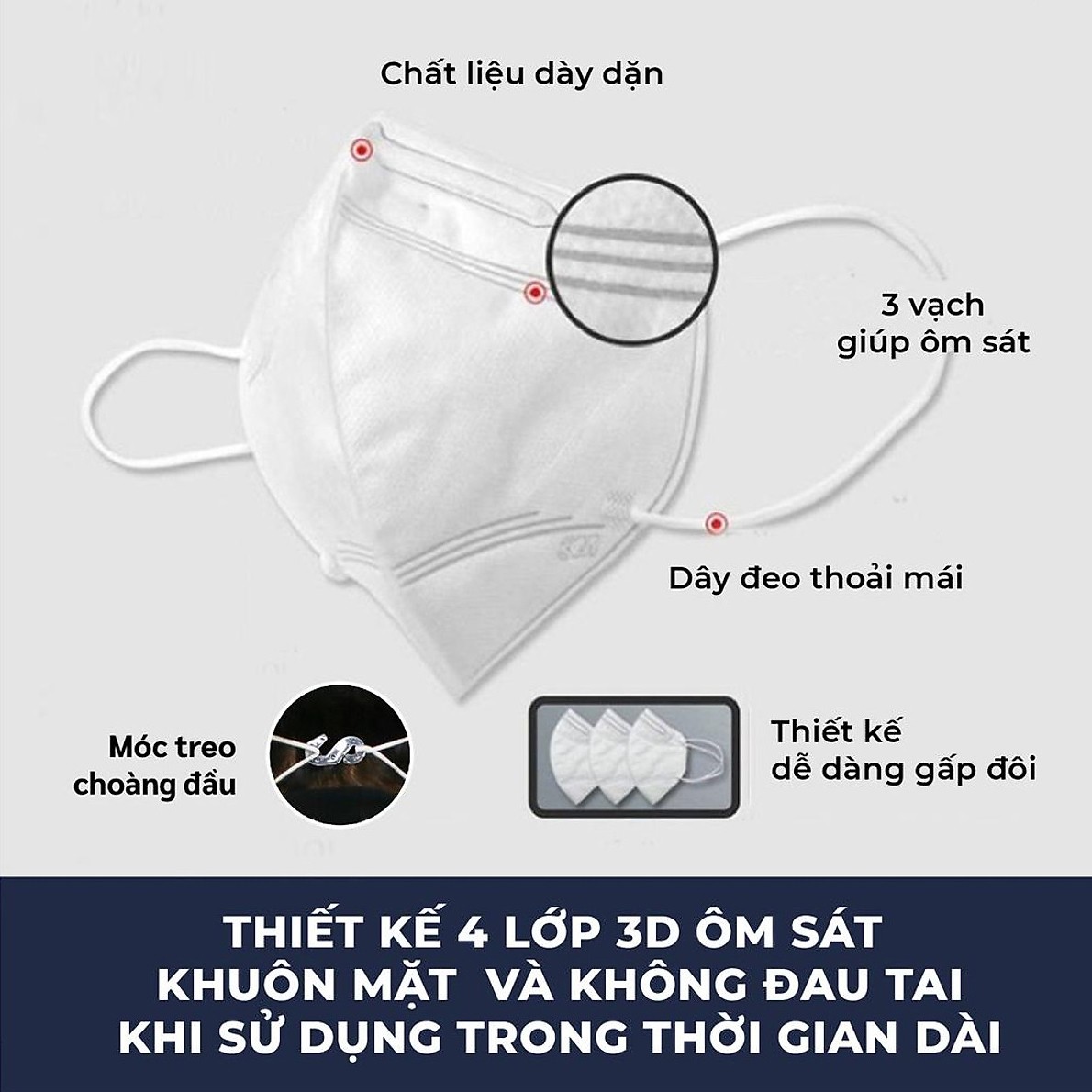 - Thiết kế 4 lớp 3D và dây đeo co giãn có kèm móc đeo qua đầu (khi cần), giúp ôm sát khuôn mặt và còn tăng tính thoải mái, dễ thở khi đeo, ôm khít, vừa vặn cho khuôn mặt người châu Á.