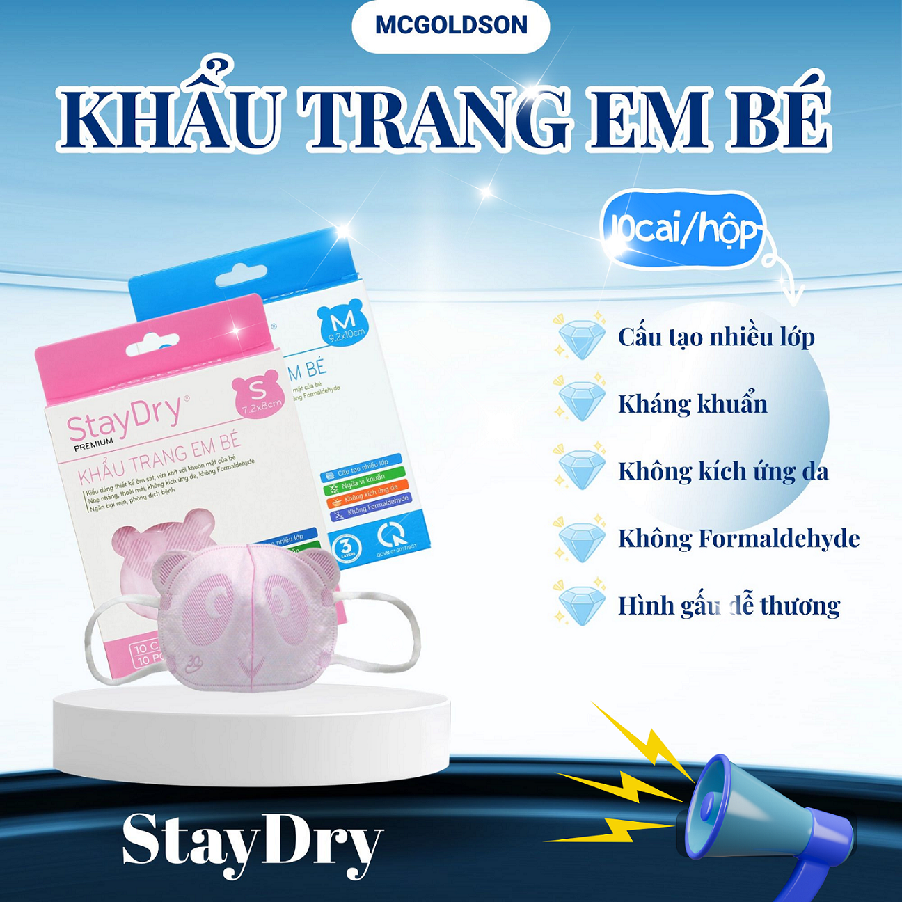 Khẩu trang của 3Q bán 12k/bịch 10 cái, trên khẩu trang có in logo 3Q. McGoldson lấy về đóng hộp để tên mình rồi bán giá 35k. Mình đã mua thử và so sánh hàng y chang nhau. McGoldson bán chênh lệch rất cao. Mùa dịch mình tìm khẩu trang mua cho con, ko có nhiều thời gian nên chưa tìm thấy cửa hàng của 3Q. Giờ thì bản thân mình ko dùng đồ của McGoldson nữa.