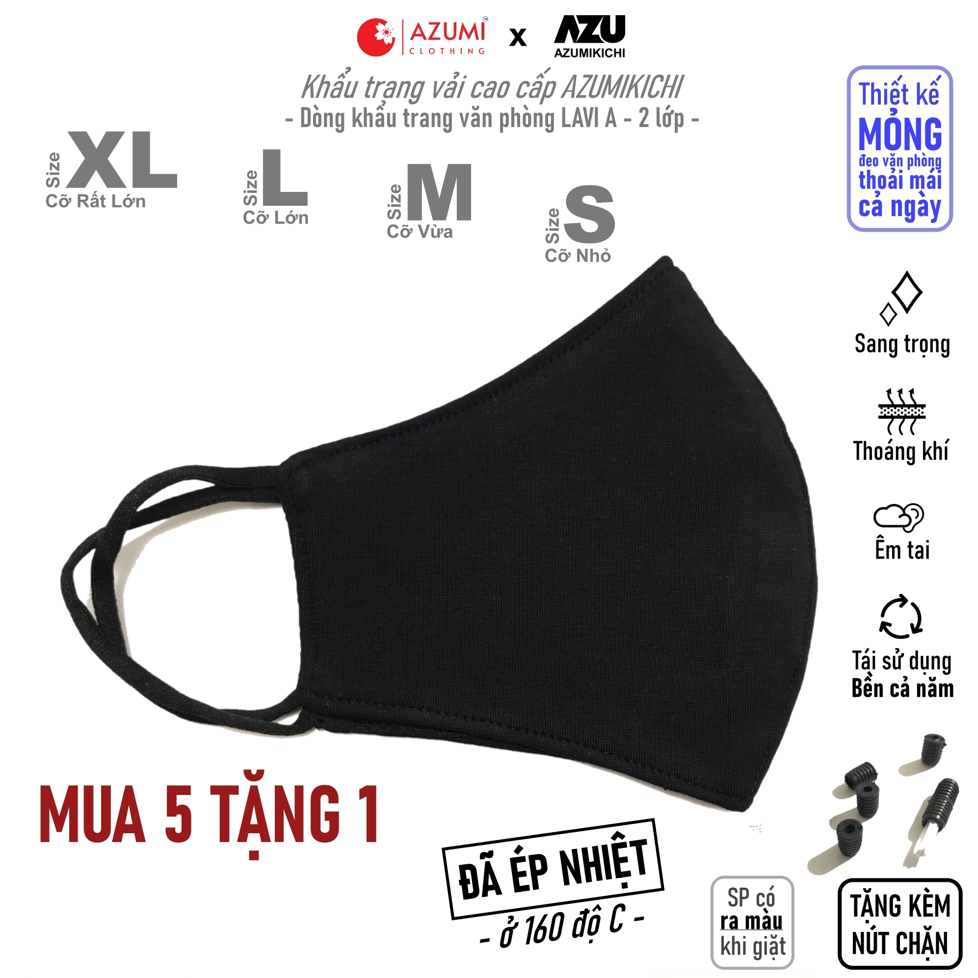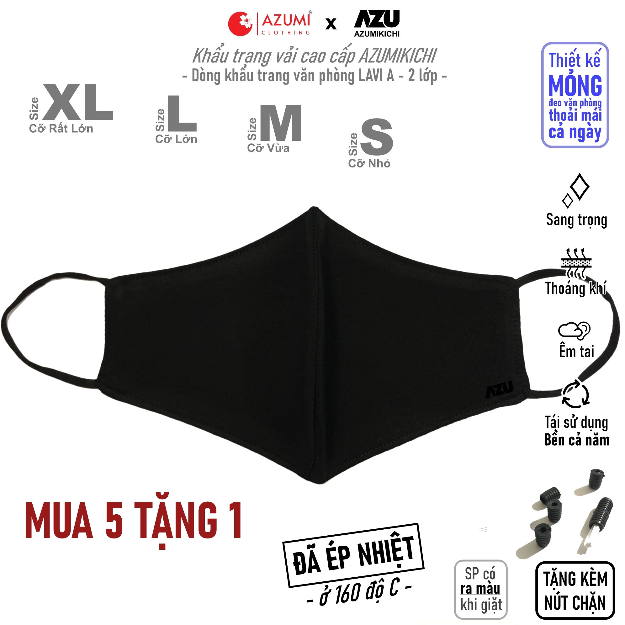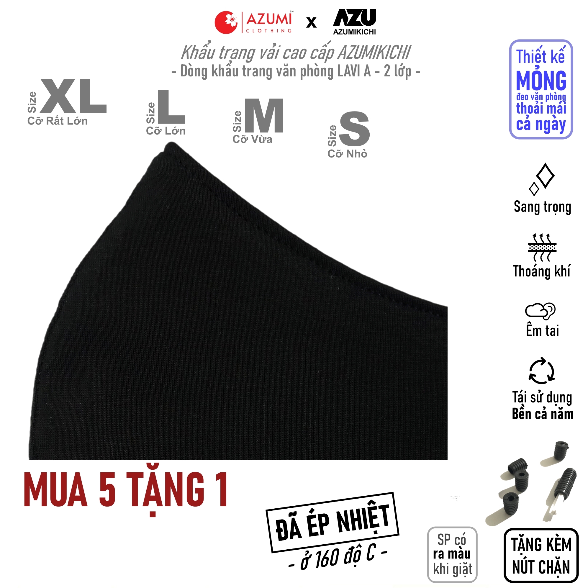 Thông số kỹ thuật Khẩu trang vải Azumikichi màu đen, khẩu trang thời trang cao cấp sang trọng
