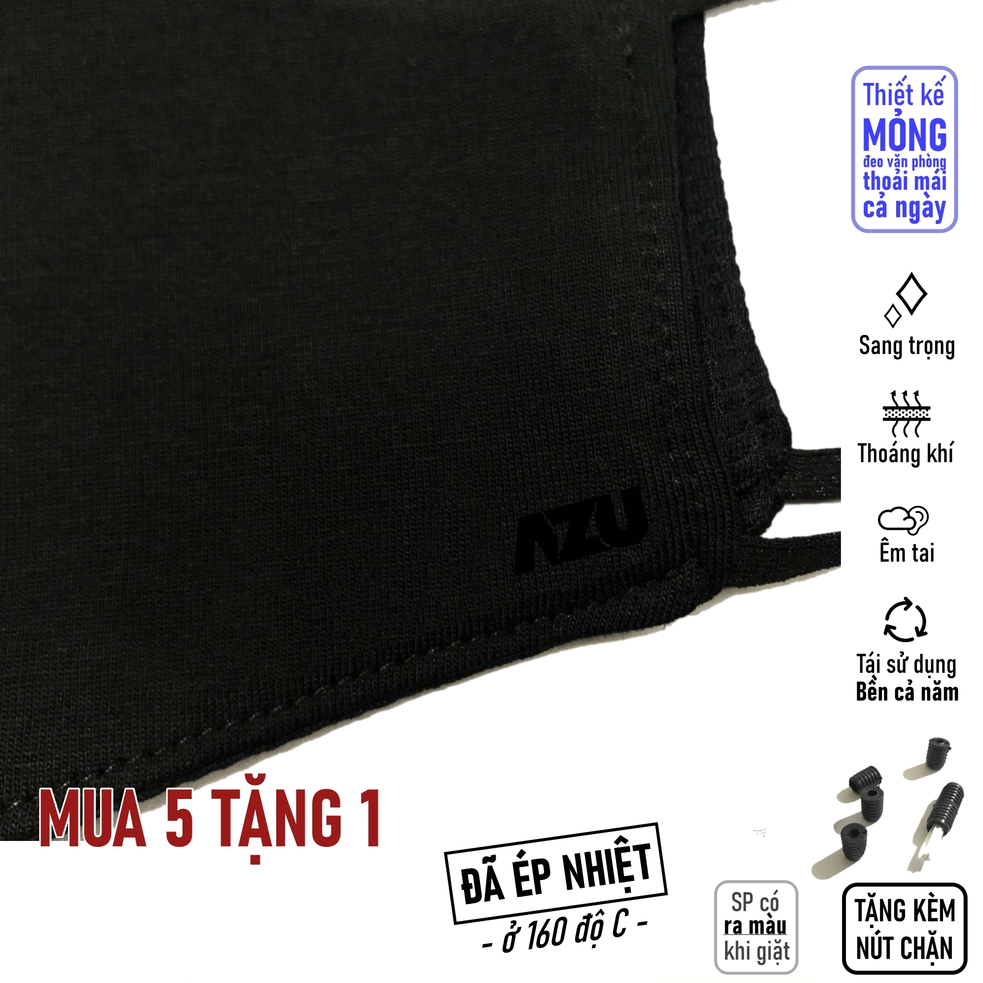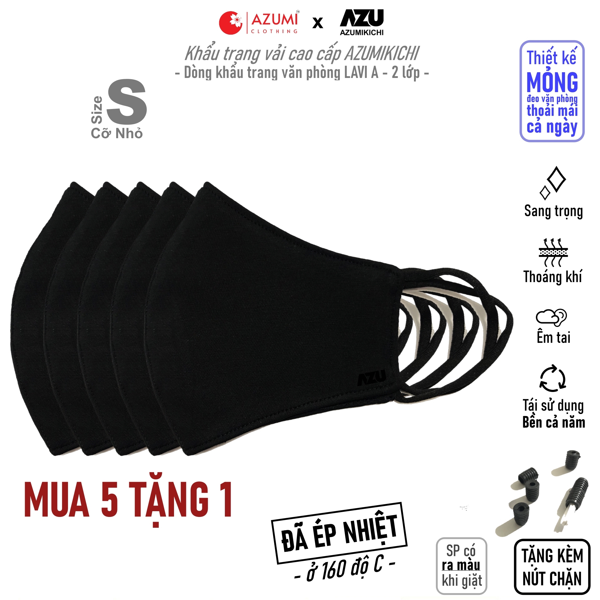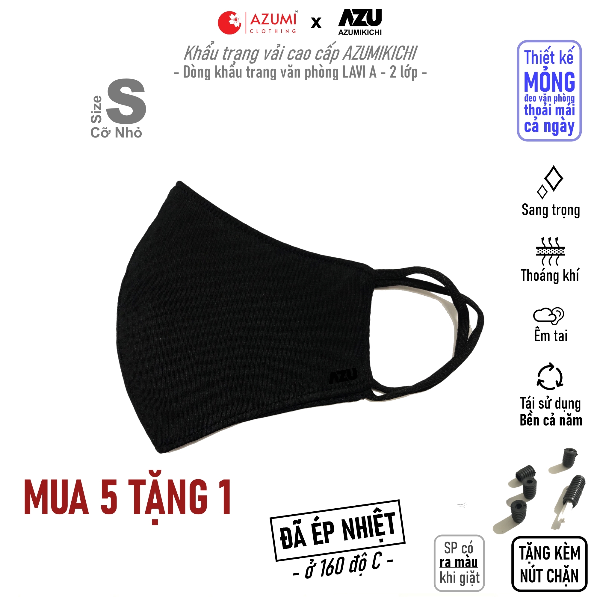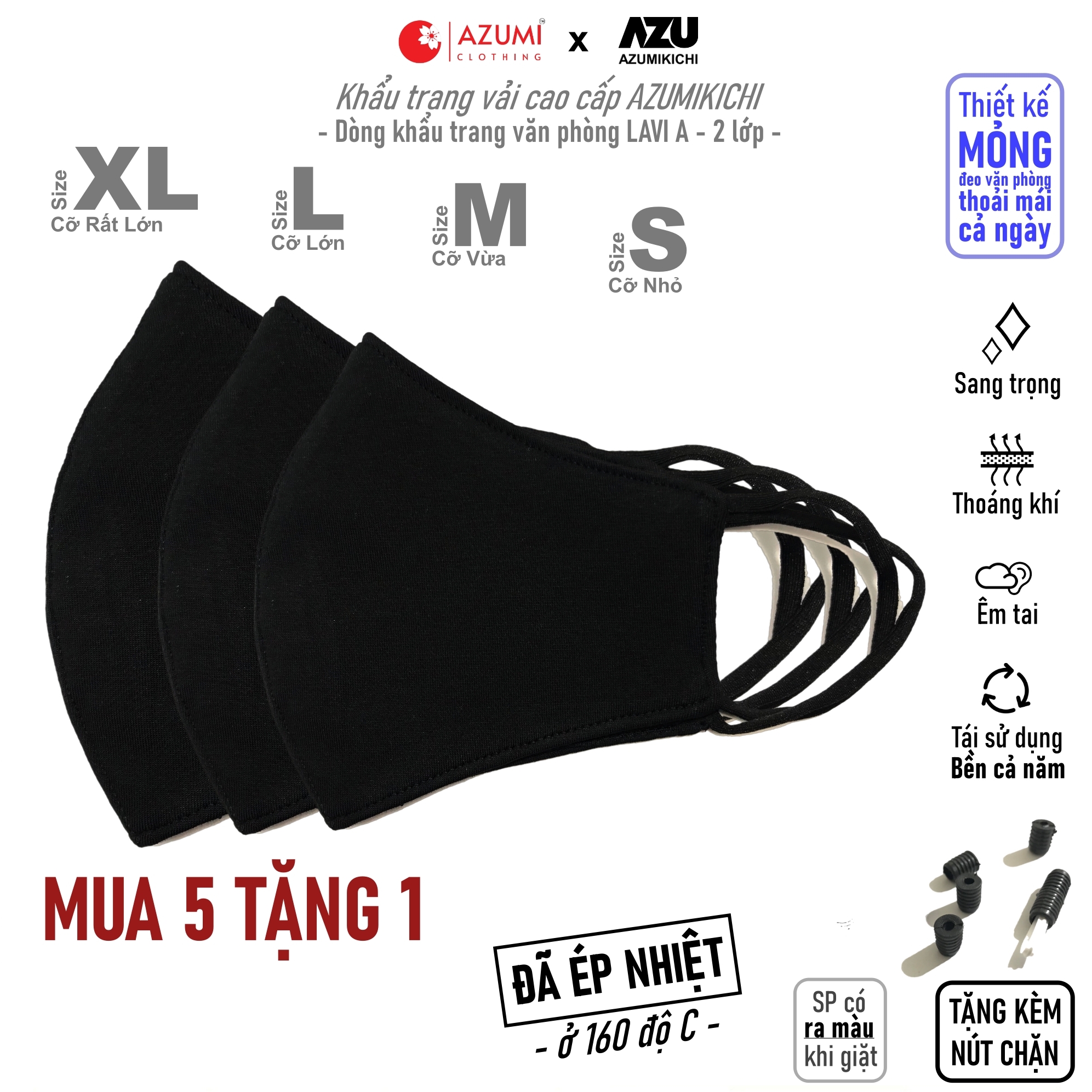 Thông số kỹ thuật Khẩu trang vải Azumikichi màu đen, khẩu trang thời trang cao cấp sang trọng