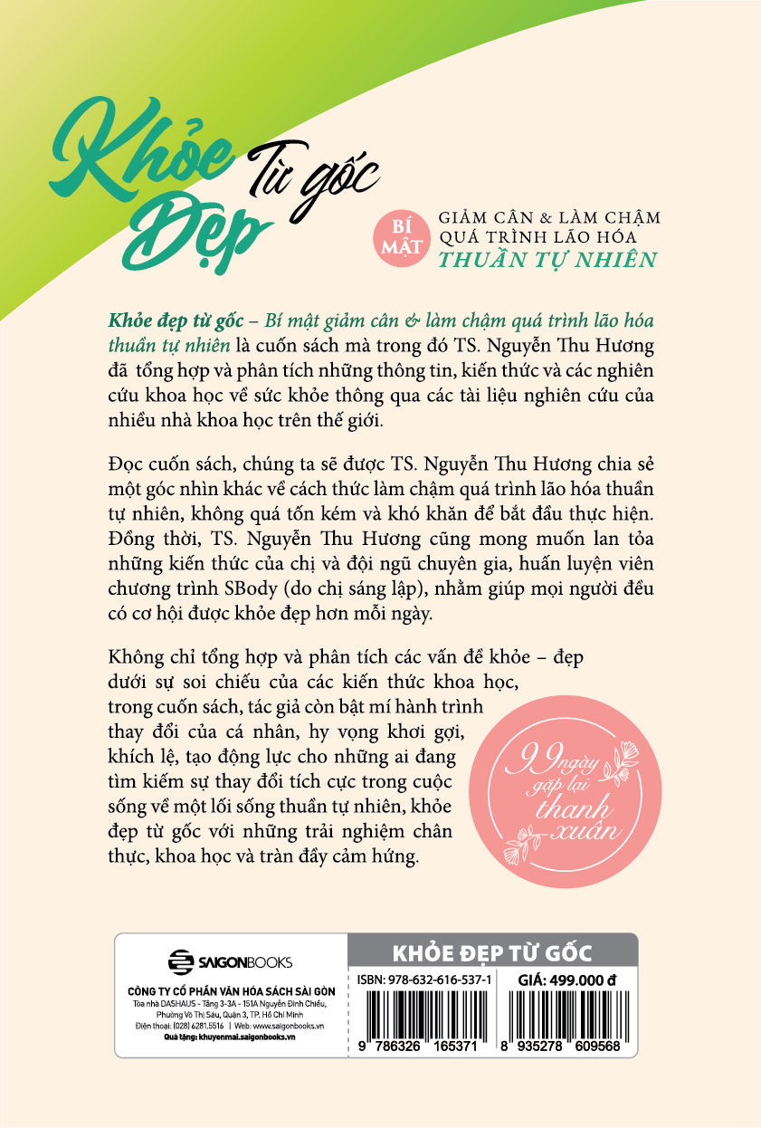 “Khỏe đẹp từ gốc” là hành trình chân thật và truyền cảm hứng của TS. Nguyễn Thu Hương – người phụ nữ từng thành công rực rỡ trong lĩnh vực truyền thông, từng trải qua những biến cố sức khỏe nghiêm trọng, và đã tìm lại chính mình nhờ vào việc thay đổi lối sống.Cuốn sách được viết nên từ trải nghiệm thực tế, kết hợp với kiến thức y sinh học hiện đại, cùng kết quả thực nghiệm từ chương trình huấn luyện “SBody - Khỏe đẹp từ gốc” - nơi hàng trăm học viên đã trải qua những thay đổi tích cực về thể chất, tinh thần và thậm chí là “tuổi sinh học”.