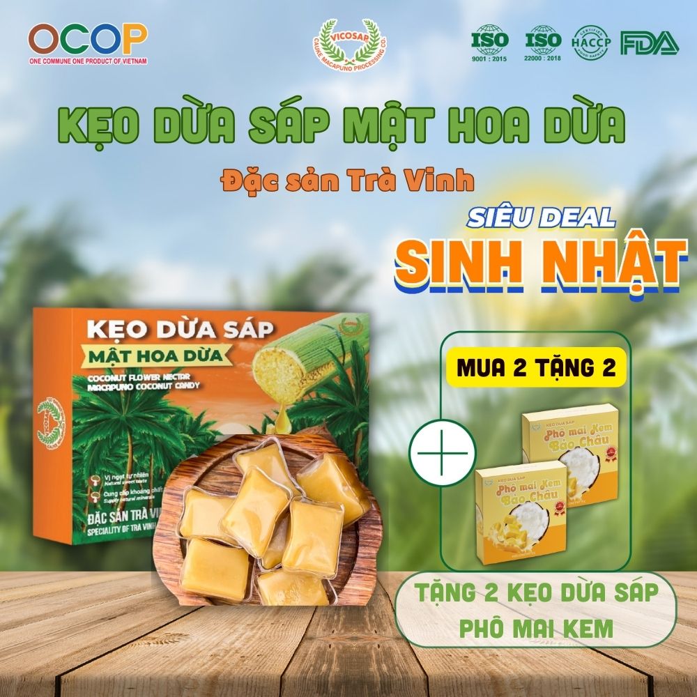 - Kẹo dừa sáp mật hoa dừa là sản phẩm được cải tiến dựa trên những loại kẹo dừa sáp truyền thống, sử dụng kết hợp 02 nguồn nguyên liệu đặc sản vô cùng nổi tiếng chính gốc Trà Vinh là dừa sáp Trà Vinh và mật hoa dừa Trà Vinh.
