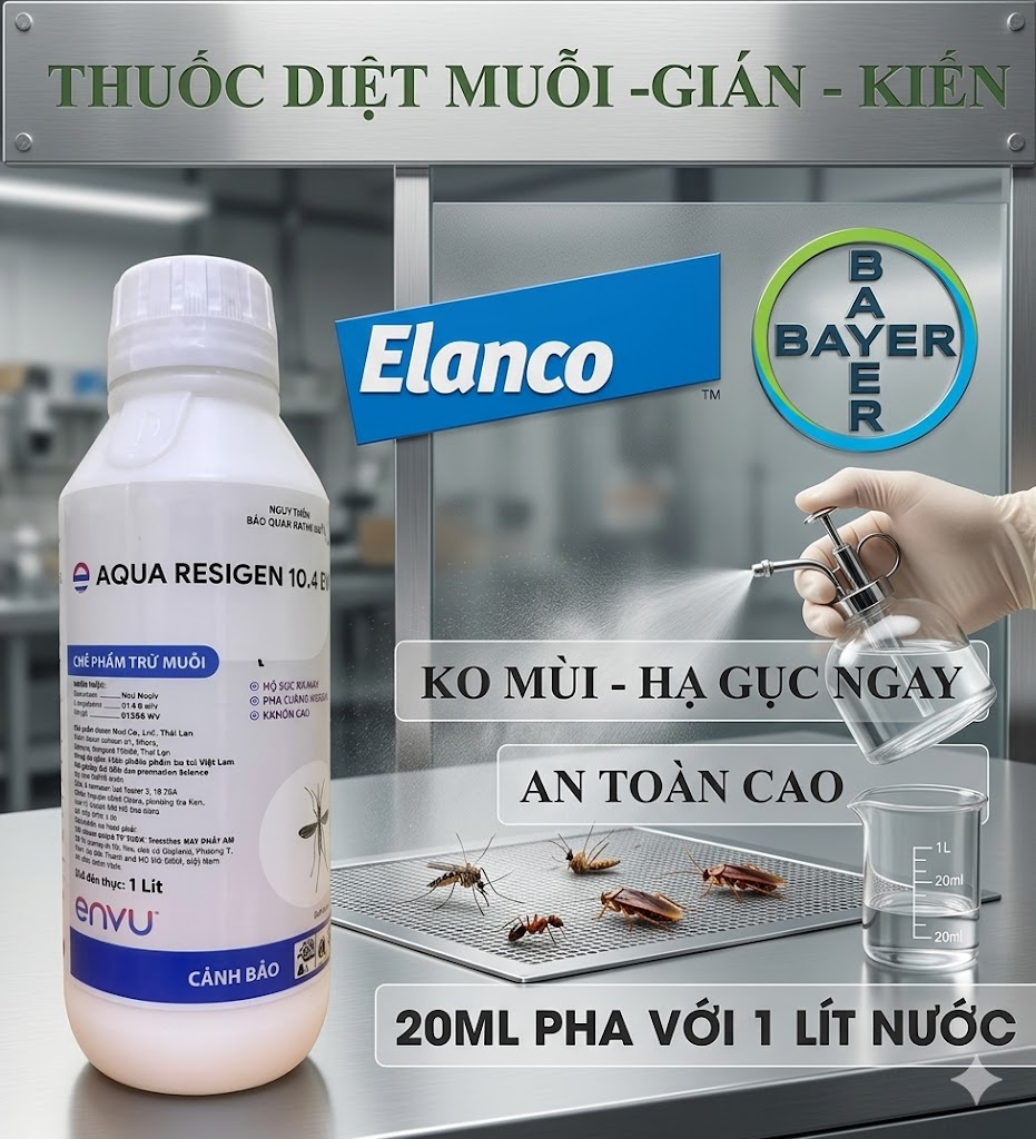- Thuốc diệt muỗi Aqua Resigen 10.4 EW là chế phẩm diệt muỗi số 1 của hãng Bayer (Đức) nổi tiếng trên khắp thế giới. Với liều lượng thuốc cực nhỏ nhưng thuốc sẽ mang lại hiệu quả tối đa khi diệt muỗi, giúp bạn tiết kiệm tối đa chi phí trong quá trình xử lý côn trùng, đặc biệt là muỗi.