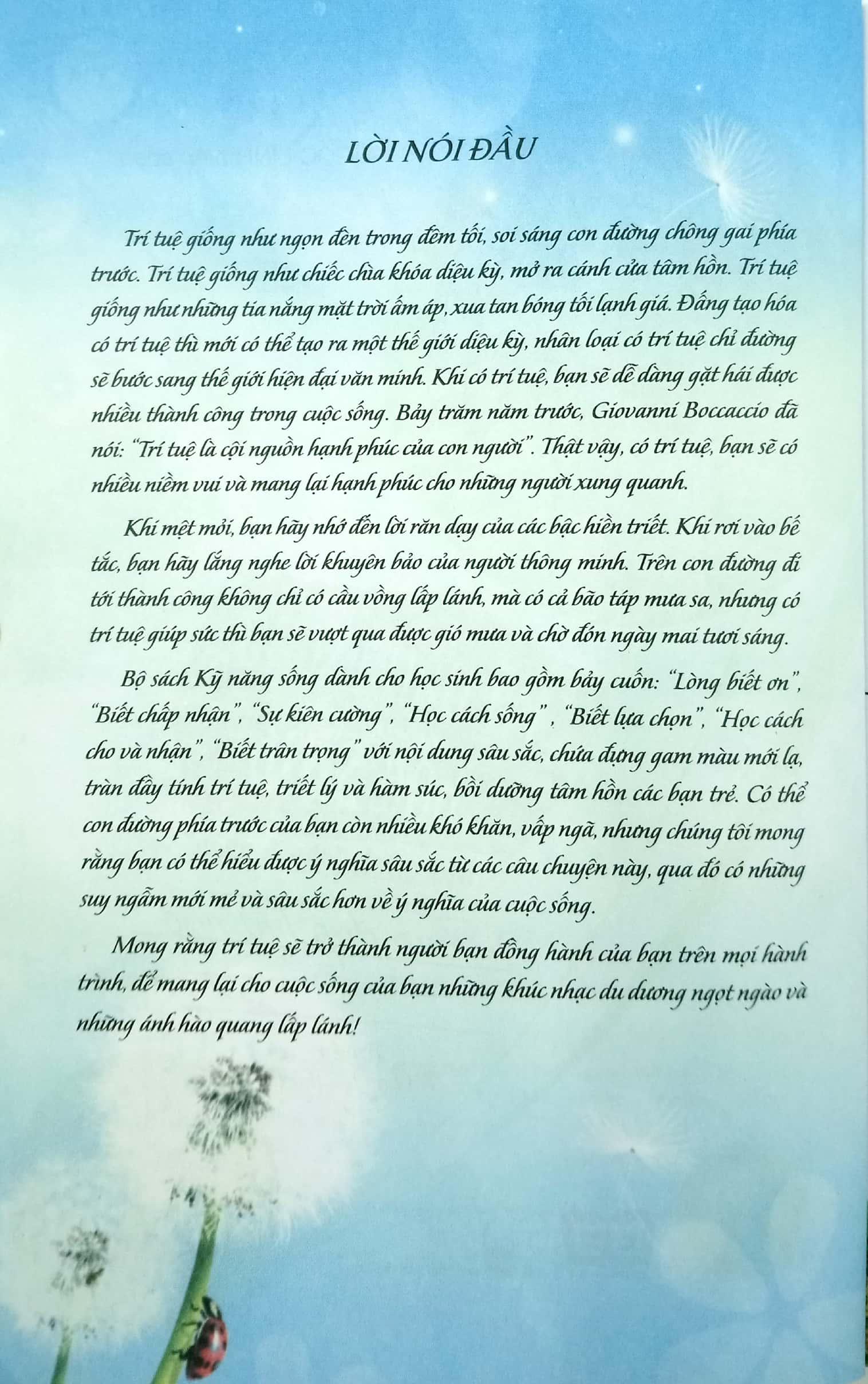 Trí tuệ giống như ngọn đèn xuyên qua đêm tối, soi sáng con đường chông gai phía trước. Trí tuệ giống như chiếc chìa khóa diệu kỳ gợi mở cánh cửa tâm hồn. Trí tuệ giống như những tia nắng mặt trời ấm áp xua tan bóng tối lạnh giá phủ mờ nhân loại. Đấng tạo hóa có trí tuệ mới có thể tạo ra một thế giới diệu kì; nhân loại có trí tuệ chỉ đường sẽ bước sang thế giới hiện đại văn minh. Khi bạn có trí tuệ, bạn sẽ dễ dàng gặt hái được nhiều thành công trong cuộc sống. Bảy trăm năm trước, Giovanni Boccaccio đã nói: “Trí tuệ là cội nguồn hạnh phúc của con người”. Thật vậy, có trí tuệ, bạn sẽ được trải nghiệm niềm vui và mang lại hạnh phúc cho những người xung quanh. Khi mệt mỏi, hãy nhớ đến lời răn dạy của các bậc trí giả. Khi rơi vào đường cùng bế tắc, hãy lắng nghe tiếng lòng của người thông minh. Tôi tin rằng trên con đường đi tới thành công của chúng ta không chỉ có cầu vồng lấp lánh mà có cả mưa gió cản lối nhưng có trí tuệ giúp sức, cuối cùng bạn sẽ vượt qua gió mưa và đến được với ánh sáng mặt trời ấm áp. Chúng tôi đã chọn lựa và tập hợp những câu chuyện nhiều màu sắc, đầy tính trí tuệ, hàm súc và giàu triết lí có tác dụng khích lệ ý chí thành bộ sách “Kỹ năng sống dành cho học sinh” bao gồm bảy cuốn: “Lòng biết ơn”, “Biết chấp nhận”, “Sự kiên cường”, “Học cách sống” , “Biết lựa chọn” , “Học cách cho và nhận”, “Biết trân trọng”. Có thể con đường phía trước của bạn còn nhiều trắc trở, hoặc bị chìm trong bóng tối lạnh giá, nhưng chúng tôi mong rằng bạn có thể hiểu được ý nghĩa sâu sắc từ các câu chuyện này, qua đó có được những suy ngẫm mới mẻ và sâu sắc hơn về ý nghĩa của cuộc sống. Mong rằng trí tuệ sẽ trở thành người bạn đồng hành mãi mãi của bạn trên mọi hành trình để mang lại cho cuộc sống của bạn những khúc nhạc du dương ngọt ngào và những ánh hào quang lấp lánh!Giá sản phẩm trên Tiki đã bao gồm thuế theo luật hiện hành. Bên cạnh đó, tuỳ vào loại sản phẩm, hình thức và địa chỉ giao hàng mà có thể phát sinh thêm chi phí khác như phí vận chuyển, phụ phí hàng cồng kềnh, thuế nhập khẩu (đối với đơn hàng giao từ nước ngoài có giá trị trên 1 triệu đồng).....