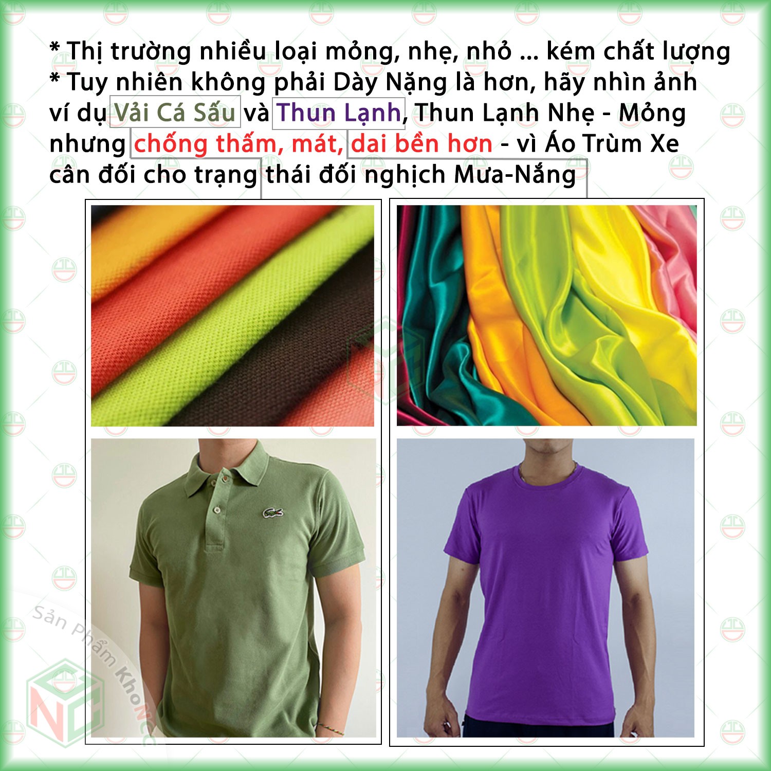 Áo Trùm Bạt Phủ Xe KhoNCC mã hàng NQL-BPXMT-Z1K là Sản Phẩm Chất Liệu Vải Dù (Vải + Nylon chống thấm) , không như một số nơi khác cao cấp lắm là Vải Dù Áo Mưa, che xe trời nắng cực kỳ hại xe (trải nghiệm bằng cách Mặc Áo Mưa Dù trời nắng chưa đầy 5 phút là mồ hôi như tắm huống gì con xe Đi Nóng Máy mới về lại che trời nắng) . Do Mưa/Nắng là 2 trạng thái đối nghịch, được Cái Lọ thì Mất Cái Chai nên chúng tôi nghiên cứu cho ra loại chất liệu Vải Dù Dành Cho Xe Máy tốt nhất đáp ứng Cân Đối cho Mưa/Nắng gần như Tuyệt Đối