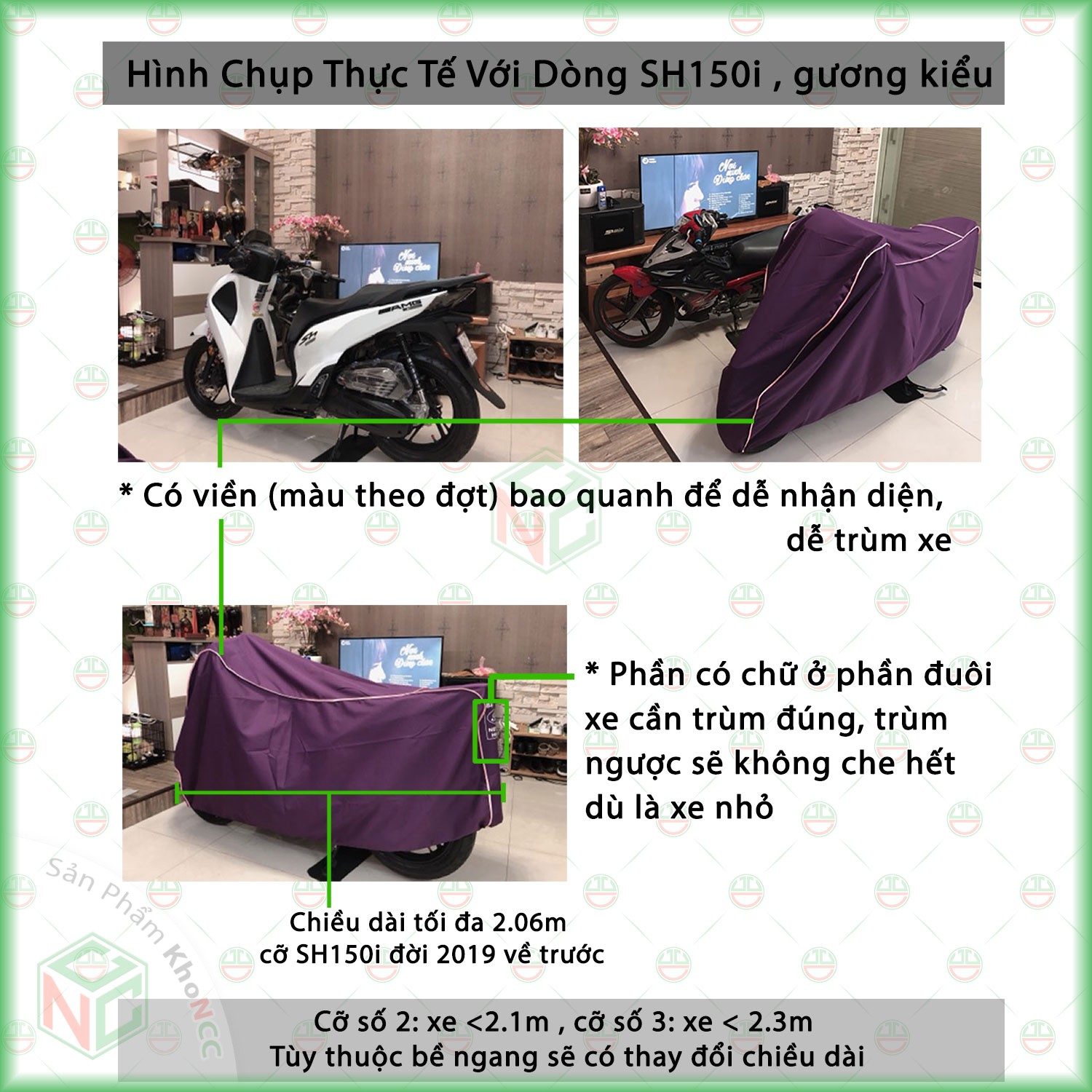 • Vải xịn đẹp, nhà mình trùm xe SH150, không có gương chiếu hậu mà cảm giác hơi chật, trùm SH mode chắc là vừa đẹp