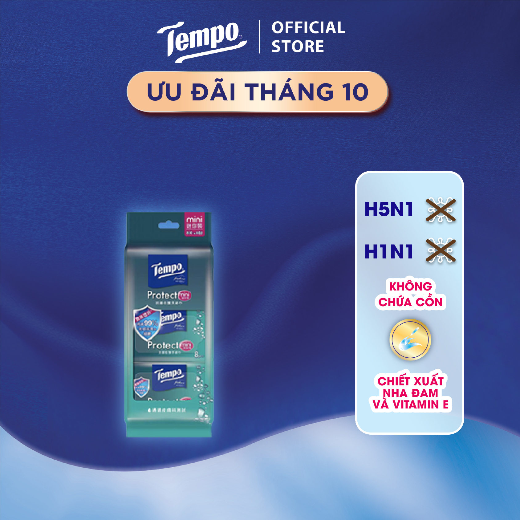 Khăn giấy ướt Mini cao cấpTempo với tính năng diệt khuẩn đến 99%, vi khuẩn gây bệnh H5N1 và H1N1 và các loại vi khuẩn khác, được sản xuất theo công nghệ tiên tiến và nguyên liệu cao cấp đạt chuẩn Châu Âu.