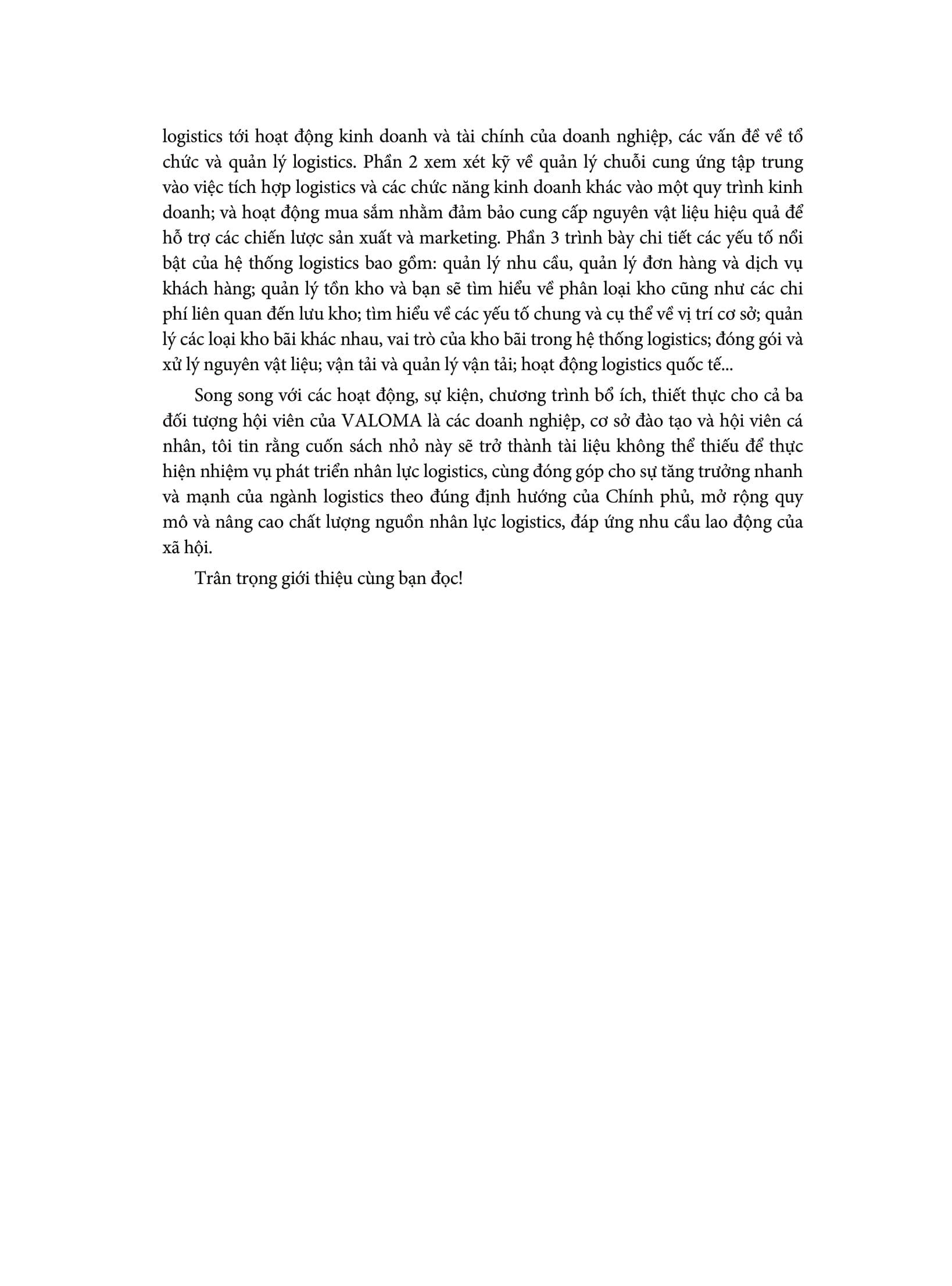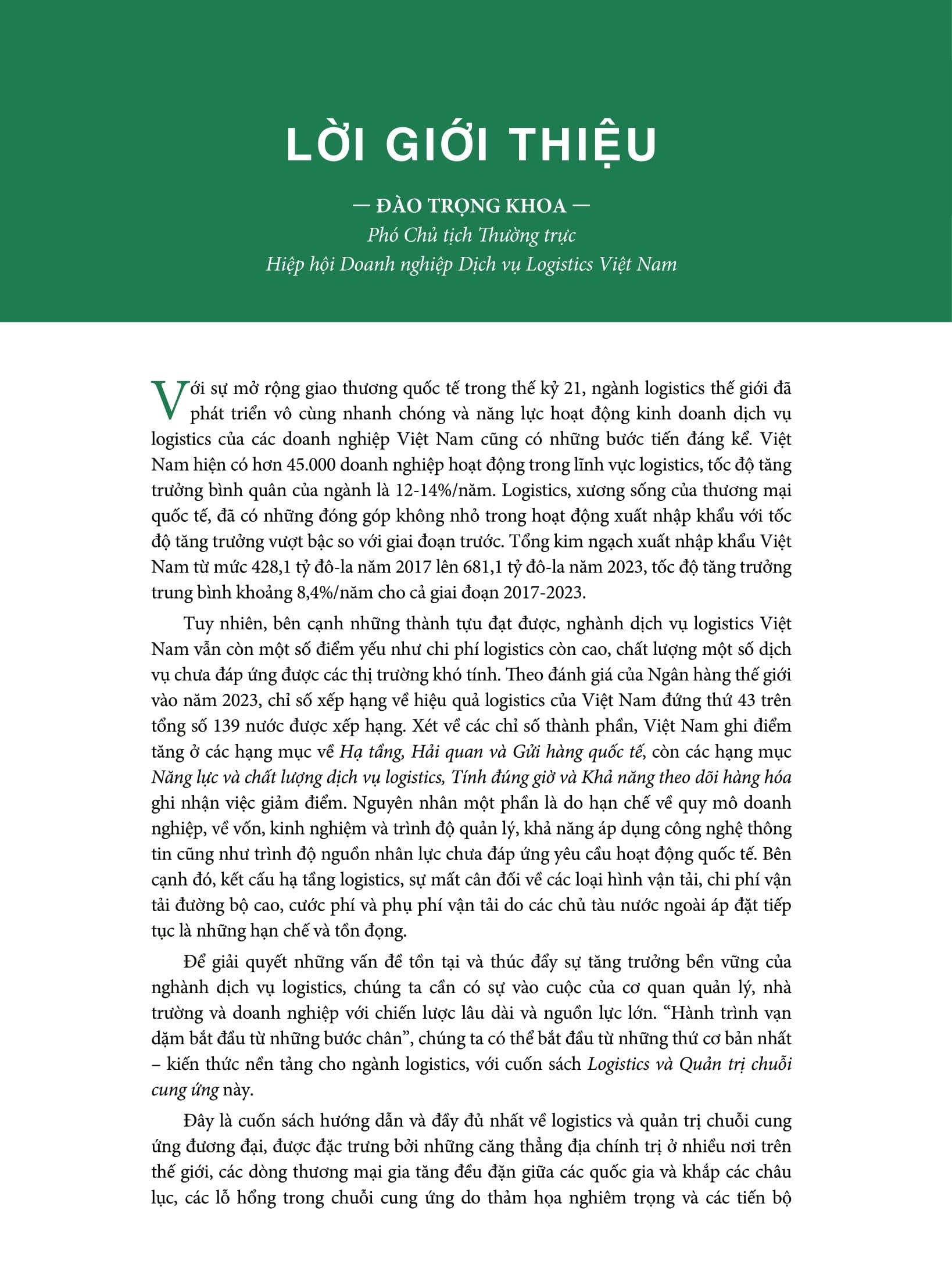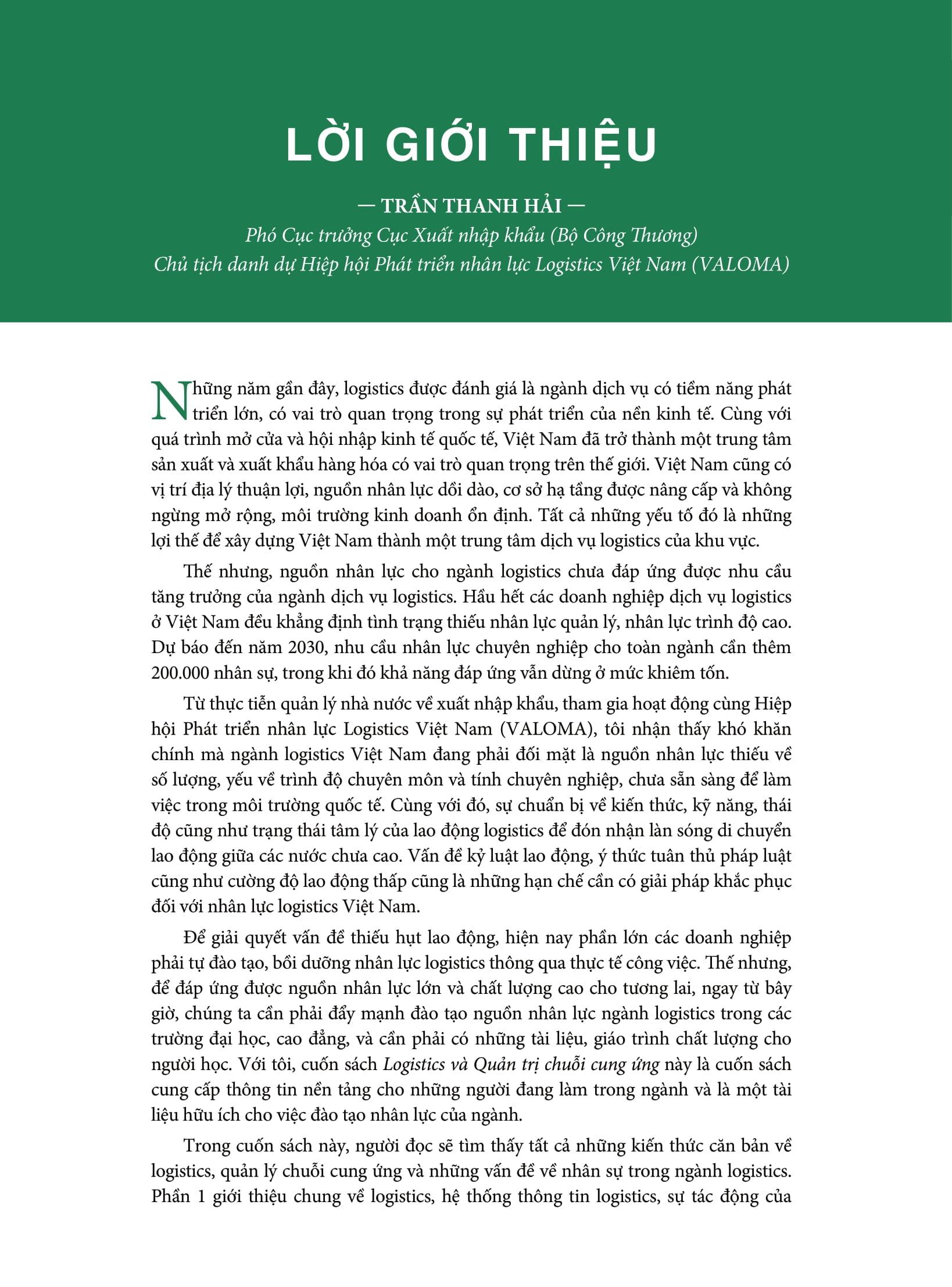 Quyển sách được ông Trần Thanh Hải - Phó Cục trưởng Cục Xuất nhập khẩu (Bộ Công Thương) và Chủ tịch danh dự Hiệp hội Phát triển nhân lực Logistics Việt Nam (VALOMA); cùng ông Đào Trọng Khoa - Phó Chủ tịch Thường trực Hiệp hội Doanh nghiệp Dịch vụ Logistics Việt Nam viết lời giới thiệu và đề xuất với bạn đọc.