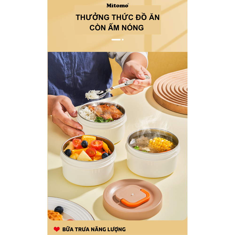 - Bộ hộp cơm giữ nhiệt Mitomo LCH-7086 được thiết kế giúp cầm nắm và di chuyển đi làm hoặc đi chơi xa tốt hơn.
