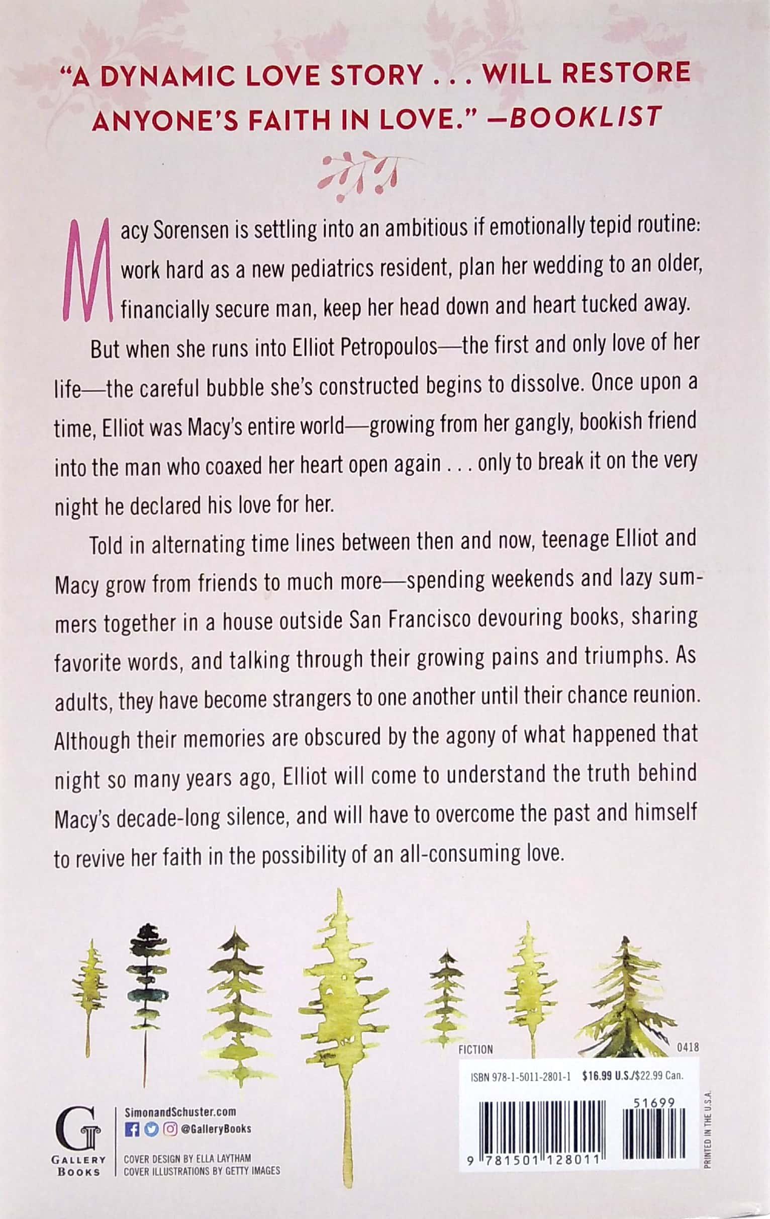 Told in alternating timelines between Then and Now, teenage Elliot and Macy grow from friends to much more—spending weekends and lazy summers together in a house outside of San Francisco devouring books, sharing favorite words, and talking through their growing pains and triumphs. As adults, they have become strangers to one another until their chance reunion. Although their memories are obscured by the agony of what happened that night so many years ago, Elliot will come to understand the truth behind Macy’s decade-long silence, and will have to overcome the past and himself to revive her faith in the possibility of an all-consuming love.
