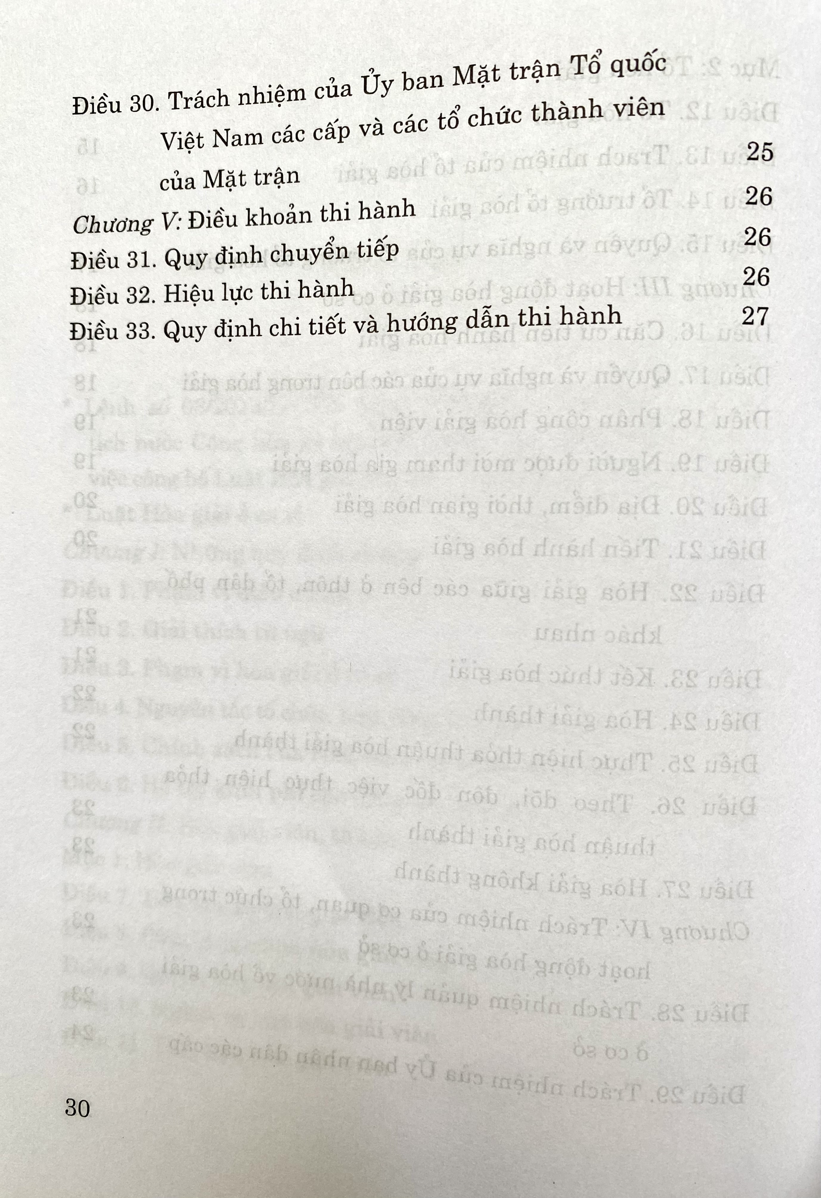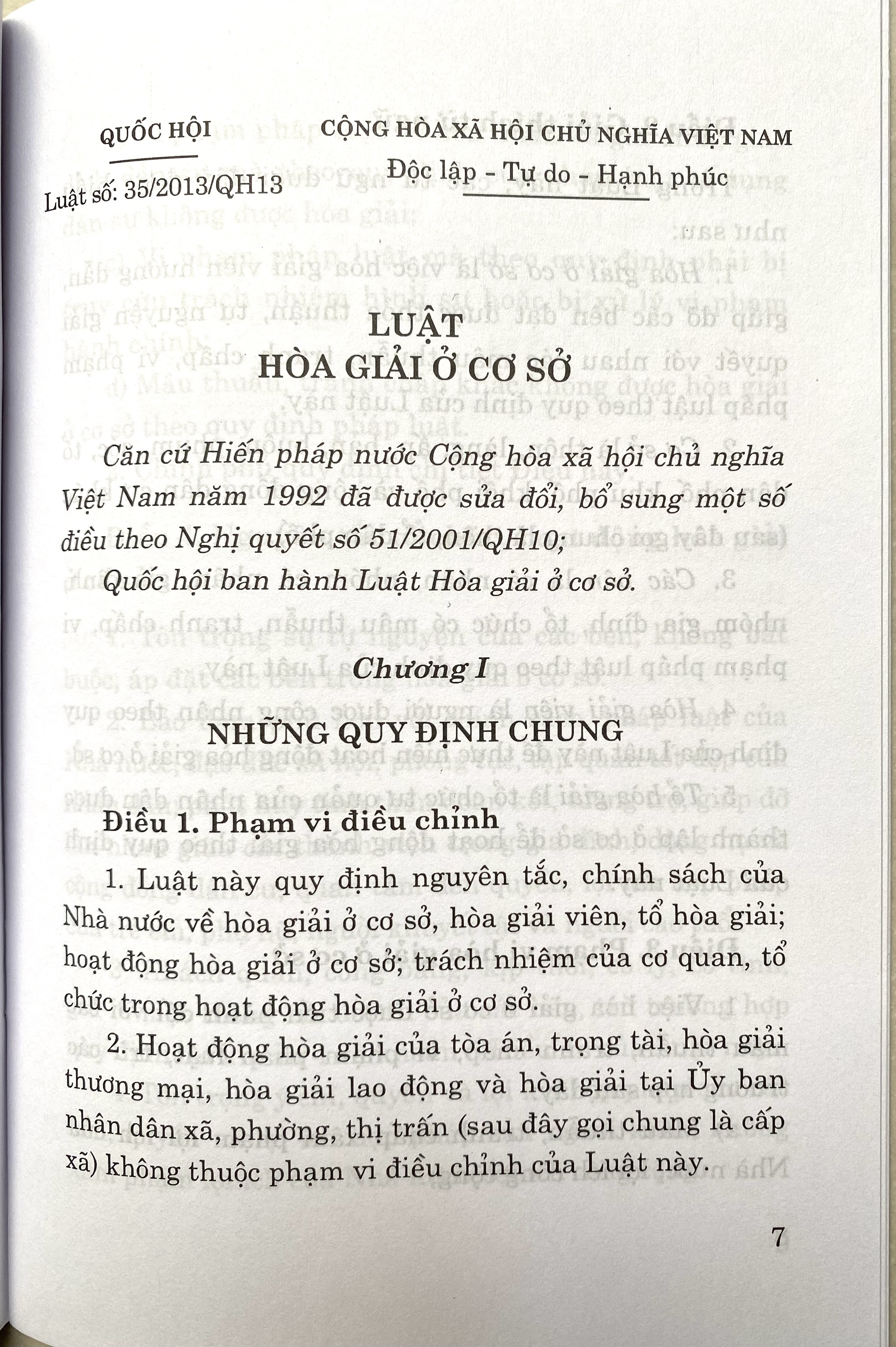 Luật Hòa giải ở cơ sở được Quốc hội khóa XIII, kỳ họp thứ 5 thông qua ngày 20/6/2013, thay thế Pháp lệnh về Tổ chức và hoạt động hòa giải ở cơ sở năm 1998. Luật có hiệu lực thi hành từ ngày 01/01/2014. Luật Hòa giải ở cơ sở năm 2013 được ban hành đã tạo cơ sở pháp lý quan trọng cho việc tổ chức và hoạt động hòa giải ở cơ sở; thúc đẩy sự tham gia của toàn xã hội, đặc biệt là Mặt trận Tổ quốc Việt Nam vào công tác hòa giải; bảo đảm tính linh hoạt, mềm dẻo, giải quyết kịp thời các mâu thuẫn, tranh chấp nhỏ trong nhân dân ở cơ sở, tiết kiệm thời gian, kinh phí cho Nhà nước và nhân dân. Nội dung cuốn sách Luật Hòa giải ở cơ sở (hiện hành) gồm toàn văn Luật Hòa giải ở cơ sở năm 2013 quy định về nguyên tắc, chính sách của Nhà nước về hòa giải ở cơ sở, hòa giải viên, tổ hòa giải; hoạt động hòa giải ở cơ sở; trách nhiệm của cơ quan, tổ chức trong hoạt động hòa giải ở cơ sở.