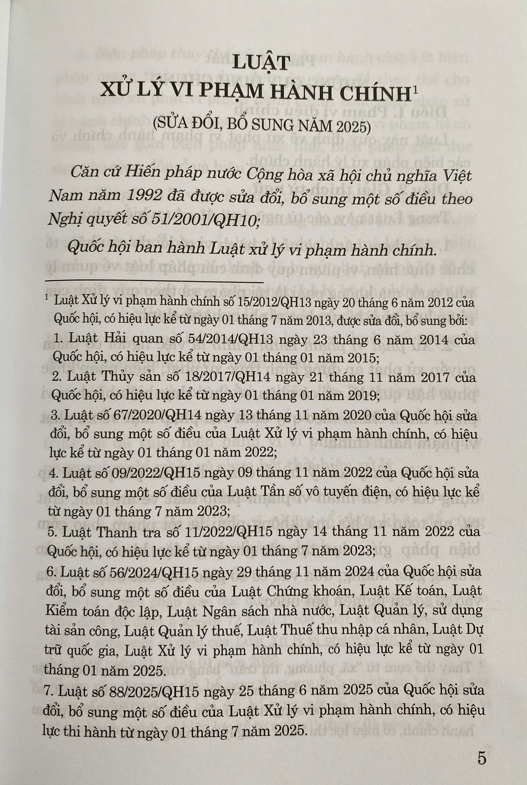 Luật Xử lý vi phạm hành chính số 15/2012/QH13 được Quốc hội ban hành ngày 20/6/ 2012. Sau đó được sửa đổi, bổ sung vào các năm 2014, 2017, 2020, 2022, 2024 và gần đây nhất Luật sửa đổi, bổ sung một số điều của Luật Xử lý vi phạm hành chính năm 2025 (Luật số 88/2025/QH15) đã được Quốc hội khóa XV, kỳ họp thứ 9 thông qua vào ngày 25/6/2025 và chính thức có hiệu lực thi hành từ ngày 01/7/2025. Việc sửa đổi, bổ sung Luật lần này xuất phát từ nhu cầu thực tiễn nhằm hoàn thiện khuôn khổ pháp lý về xử lý vi phạm hành chính, đảm bảo tính đồng bộ, thống nhất và khả thi của hệ thống pháp luật.