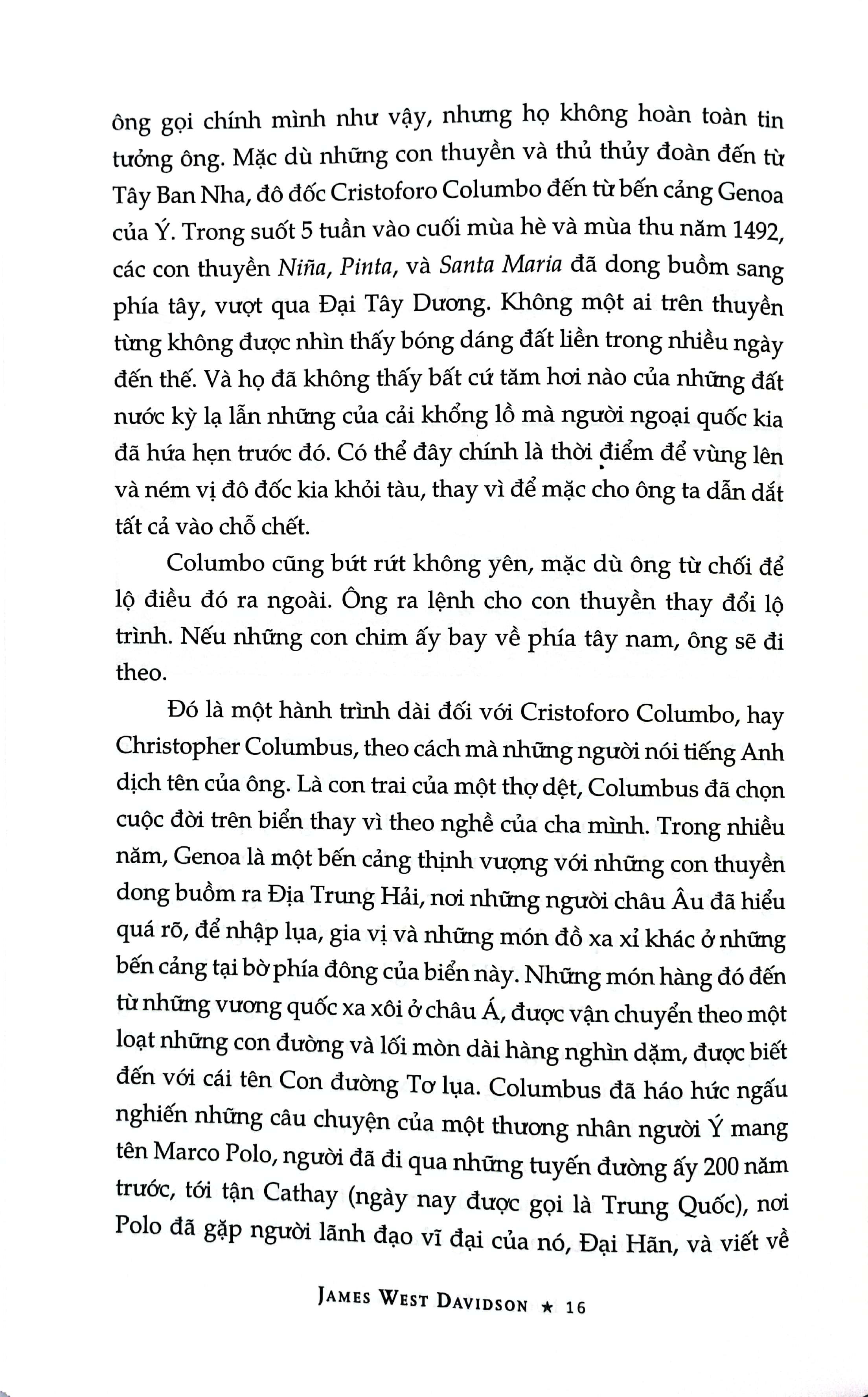 Tất cả mọi người đều sinh ra có quyền bình đẳng. Tạo hóa cho họ những quyền không ai có thể x.âm phạm được; trong những quyền ấy, có quyền được sống, quyền tự do và quyền mưu cầu hạnh phúc. Nhưng làm thế nào mà một quốc gia tuyên bố tự do khi mà hàng trăm nghìn người dân của nó vốn bị bắt đem tới Châu Mỹ như những nô lệ? Làm thế nào mà những nhà lập quốc Hoa Kỳ tôn vinh bình đẳng khi mà phụ nữ ở đất nước này đã từng không được trao cho những quyền như của nam giới? Câu trả lời cho những lý tưởng có vẻ chỉ giống như truyện cổ tích, quá xa rời thế giới thực sẽ được tìm thấy trong các phân tích thấu đáo, căn kẽ của James West Davidson.