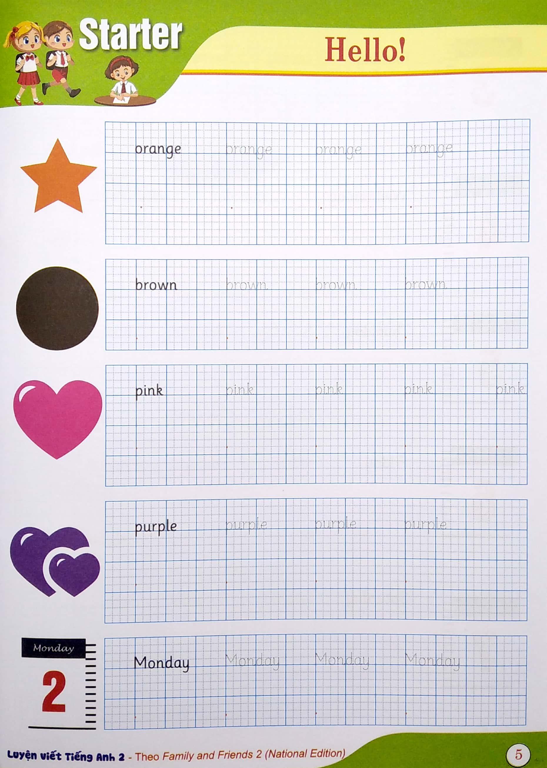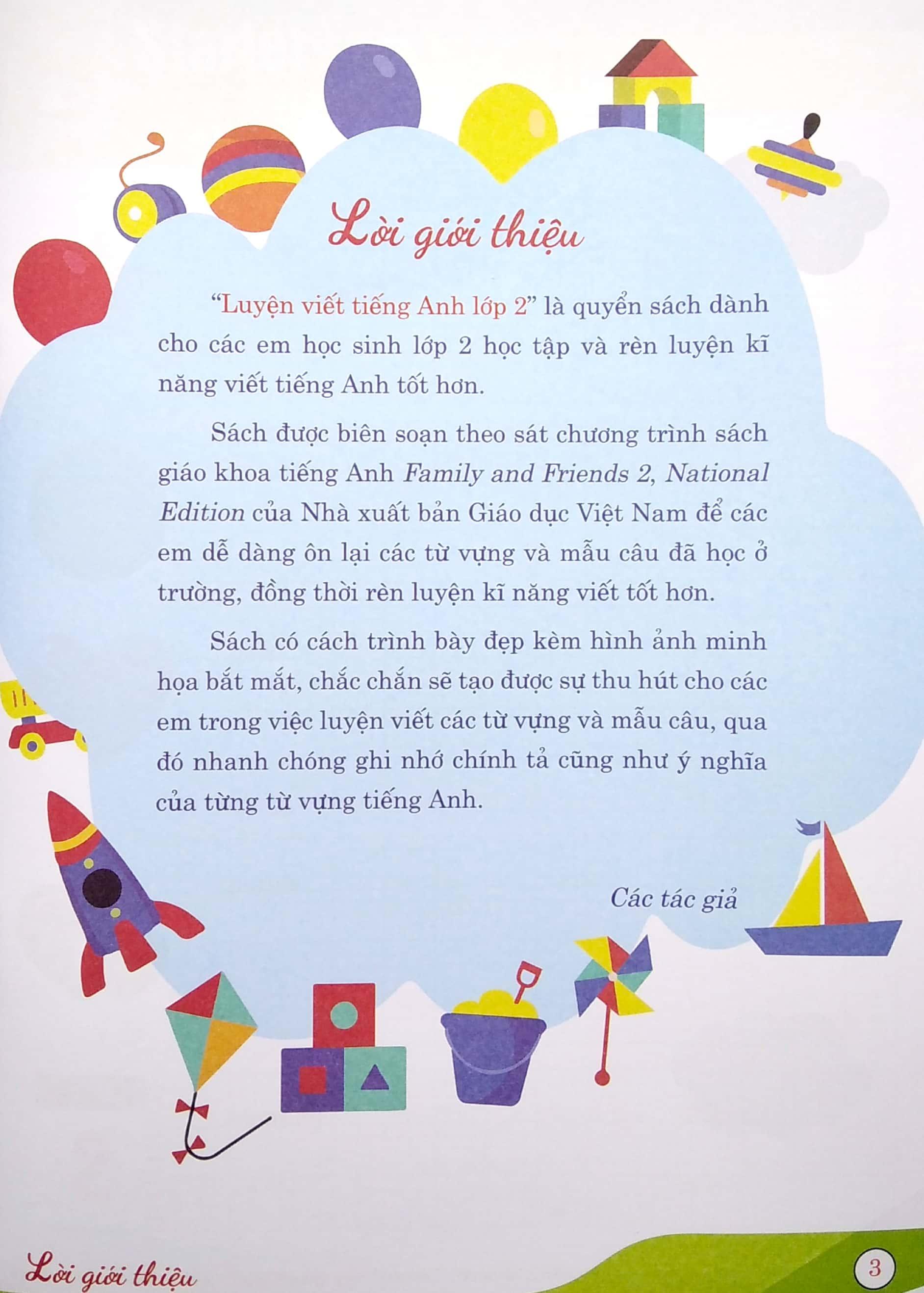 “Luyện viết tiếng Anh lớp 2” là quyển sách dành cho các em học sinh lớp 2 học tập và rèn luyện kĩ năng viết tiếng Anh tốt hơn. Sách được biên soạn theo sát chương trình sách giáo khoa tiếng Anh Family and Friends 2, National Edition của Nhà xuất bản Giáo dục Việt Nam để các em dễ dàng ôn lại các từ vựng và mẫu câu đã học ở trường, đồng thời rèn luyện kĩ năng viết tốt hơn. Sách có cách trình bày đẹp kèm hình ảnh minh họa bắt mắt, chắc chắn sẽ tạo được sự thu hút cho các em trong việc luyện viết các từ vựng và mẫu câu, qua đó nhanh chóng ghi nhớ chính tả cũng như ý nghĩa của từng từ vưng tiếng Anh.