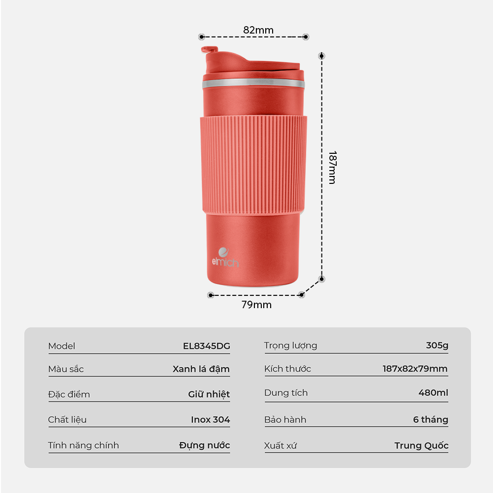 Thông số kỹ thuật Ly giữ nhiệt inox 304 Elmich EL8345 480ml, Hàng chính hãng, lớp silicone chống trượt - JoyMall