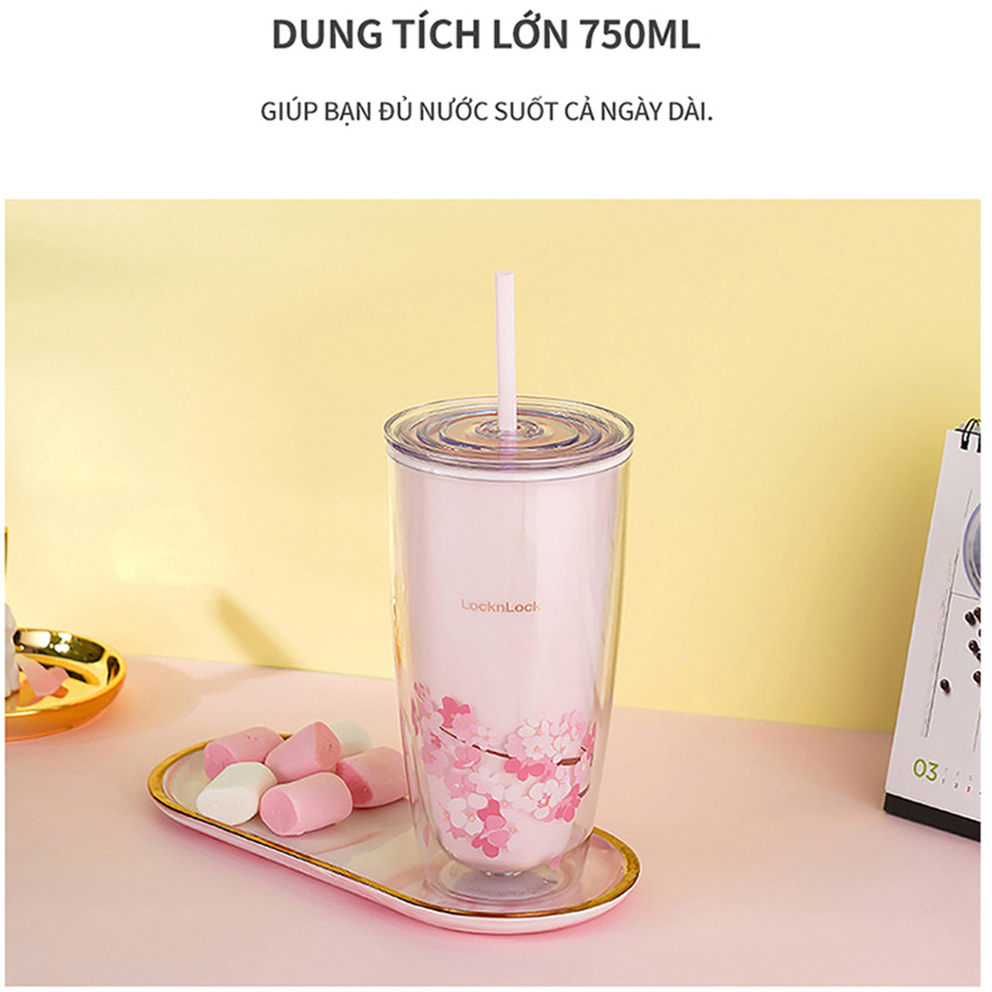 - Cấu trúc tường đôi: Ly Nhựa 2 Lớp LocknLock Double Wall Cold Cup Cherry Blossom 750ml HAP509 sử dụng vệ sinh hơn vì nước lạnh không bị ngưng tụ bên ngoài thành cốc.