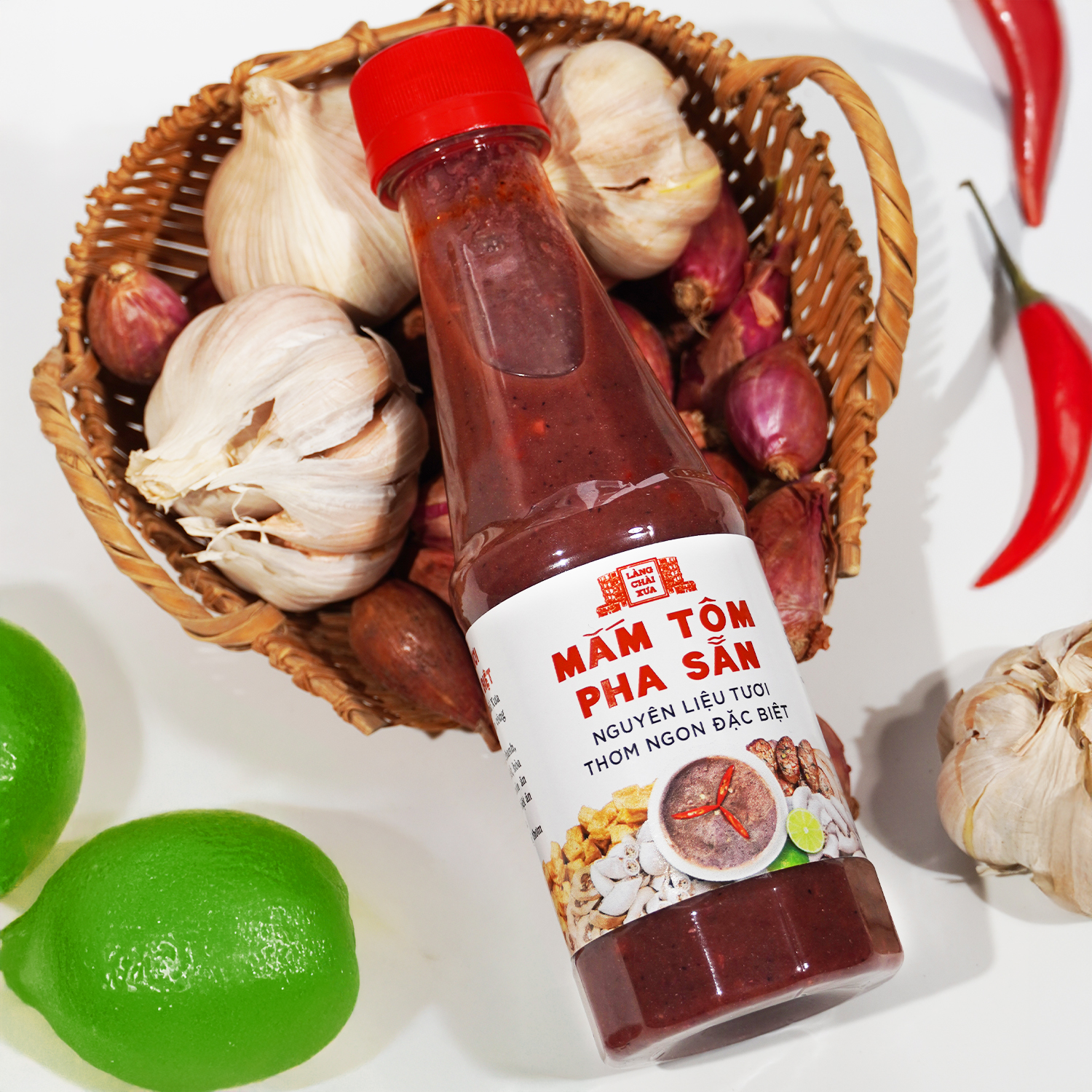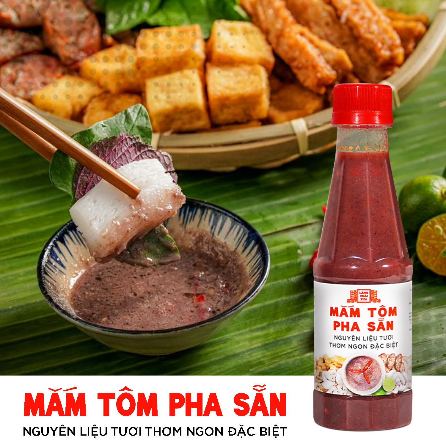 - Mắm tôm pha sẵn Làng Chài Xưa rất thơm ngon, được làm công phu từ tôm tép biển tươi. Nguyên liệu chính để ra được "MẮM TÔM" trứ danh ngon khó cưỡng: Mắm tôm ủ thùng gỗ, cùng với chanh tươi, đường, ớt xiêm tươi, muối biển tinh khiết giúp món ăn ngon hơn rất nhiều.