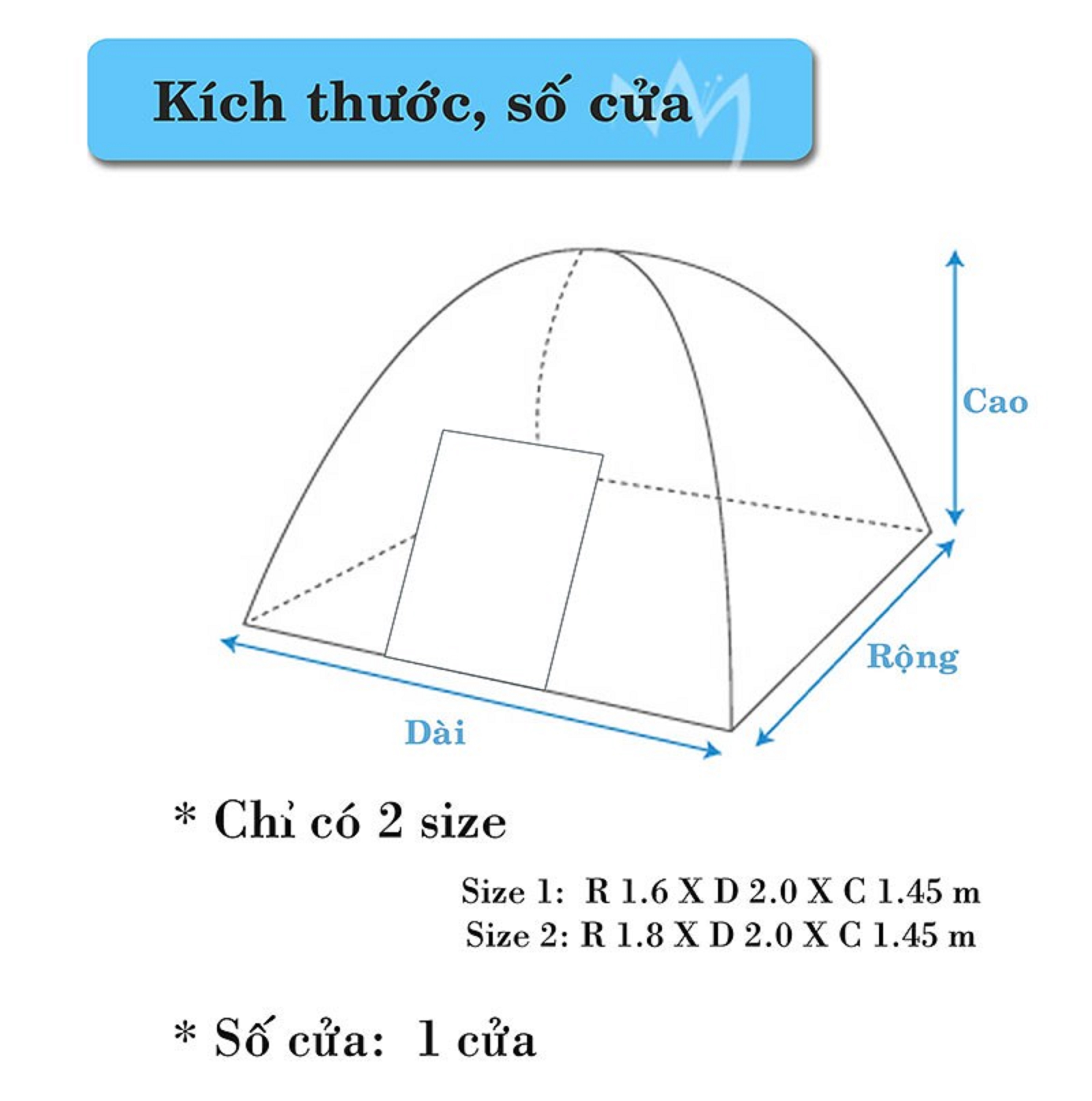 -Kích thước màn khi bung ra : Rộng 1,6m x Dài 2m x Cao 1,45m .