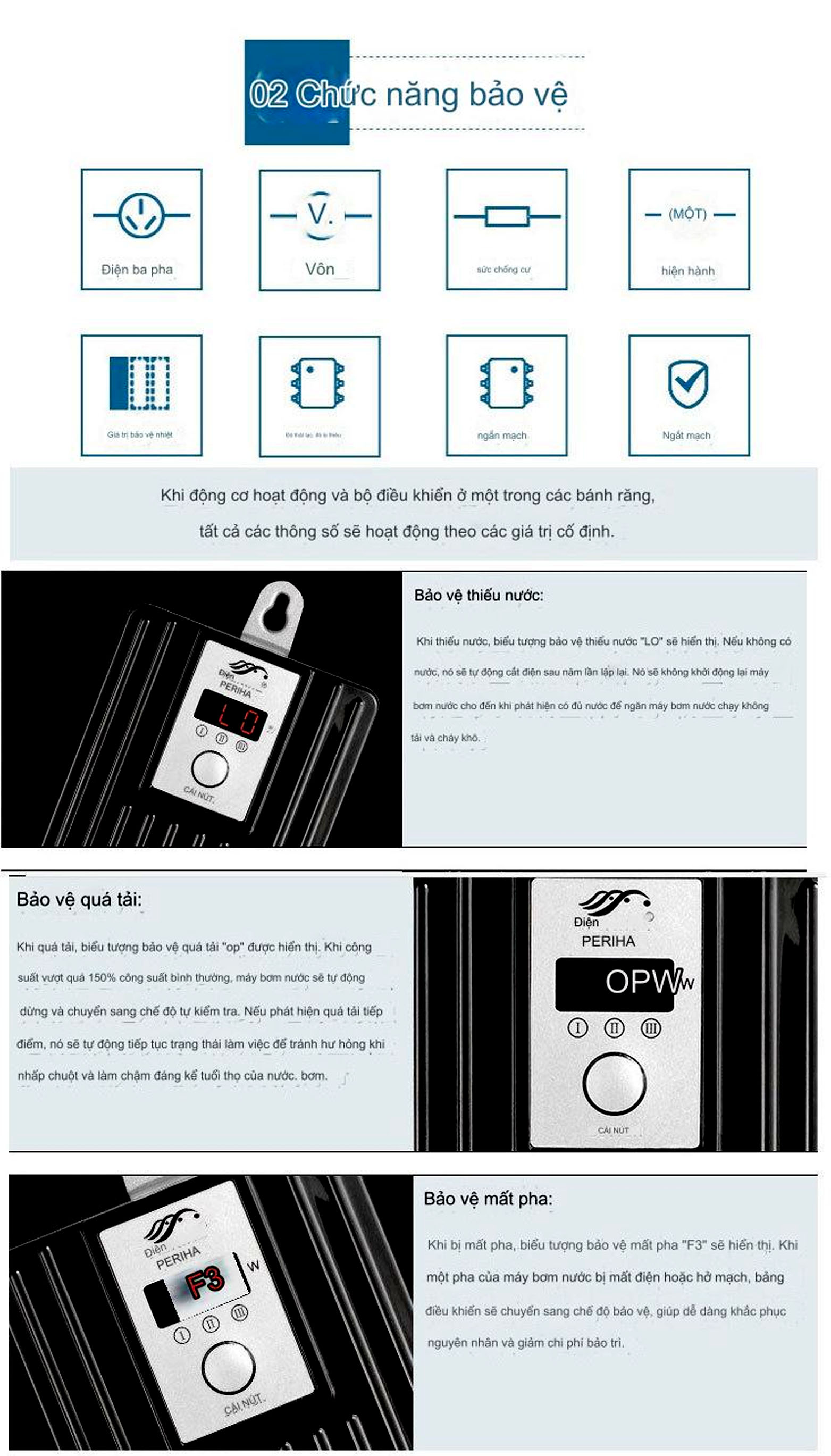 Có 3 chế độ tùy chọn cho mỗi máy với 3 điện áp, lưu lượng, chiều cao cột áp khác nhau.