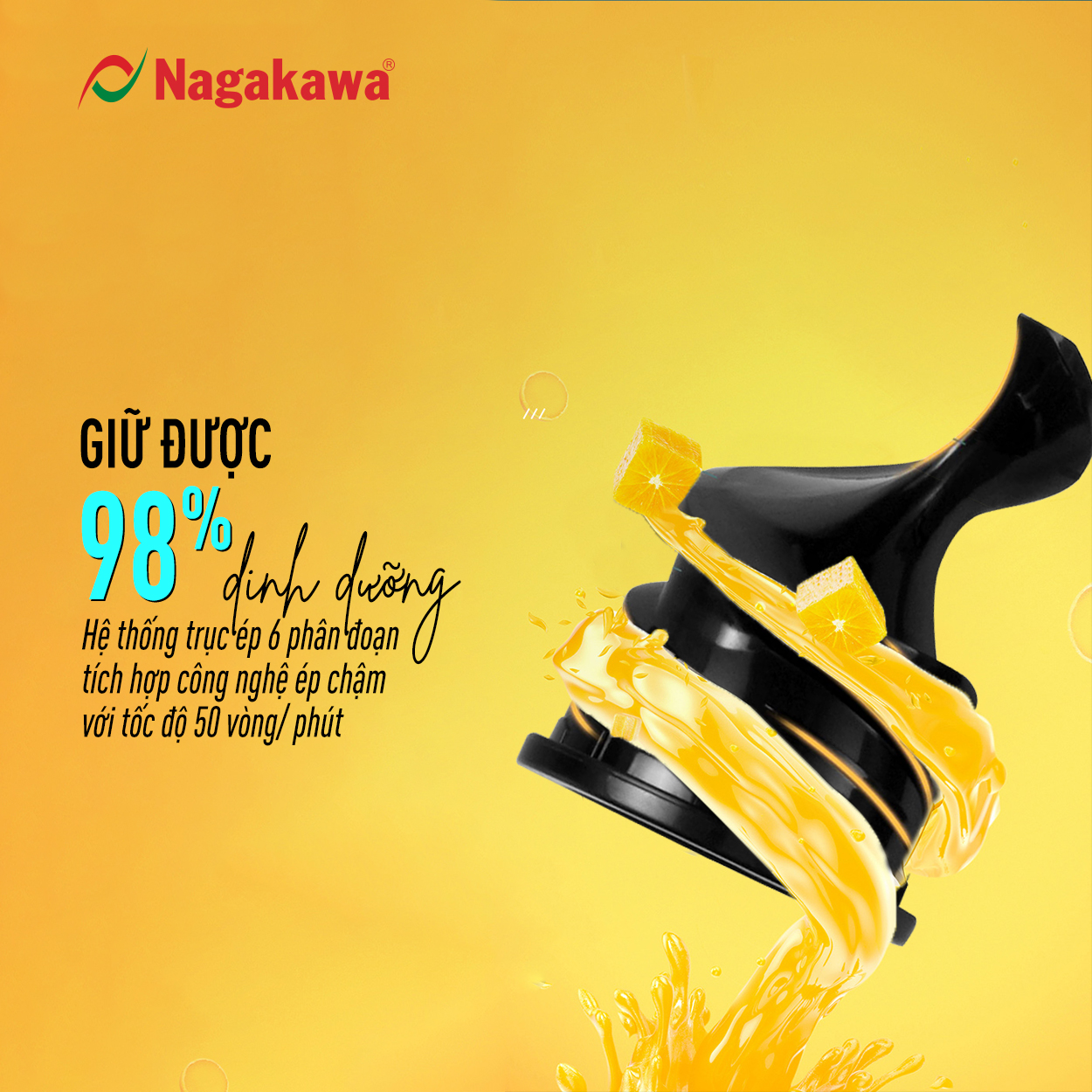 Máy ép chậm NAG0818 sở hữu công nghệ ép chậm với tốc độ ép 50 vòng/phút đảm bảo không sinh nhiệt, không làm mất chất rau củ trong quá trình hoạt động. Cơ chế này giúp máy ép chậm Nagakawa NAG0818 giữ được 98% chất dinh dưỡng, 100% hương vị. Trục ép nhựa PMMA có độ cứng gấp 10 lần thủy tinh thông thường an toàn vệ sinh thực phẩm, ép khô bã, tách nước tối đa.