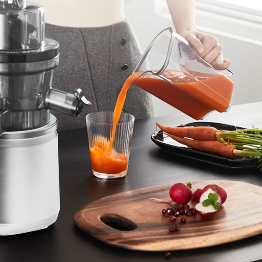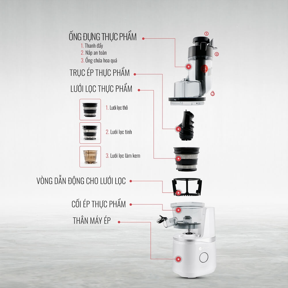 Thiết kế đặc biệt với bộ lọc siêu nhuyễn bằng inox 304 (thép không gỉ) bền và an toàn cho người sử dụng. Bộ phân tách bọt trong ca chứa nước ép mang đến cho bạn những ly nước ép chất lượng, tinh khiết.