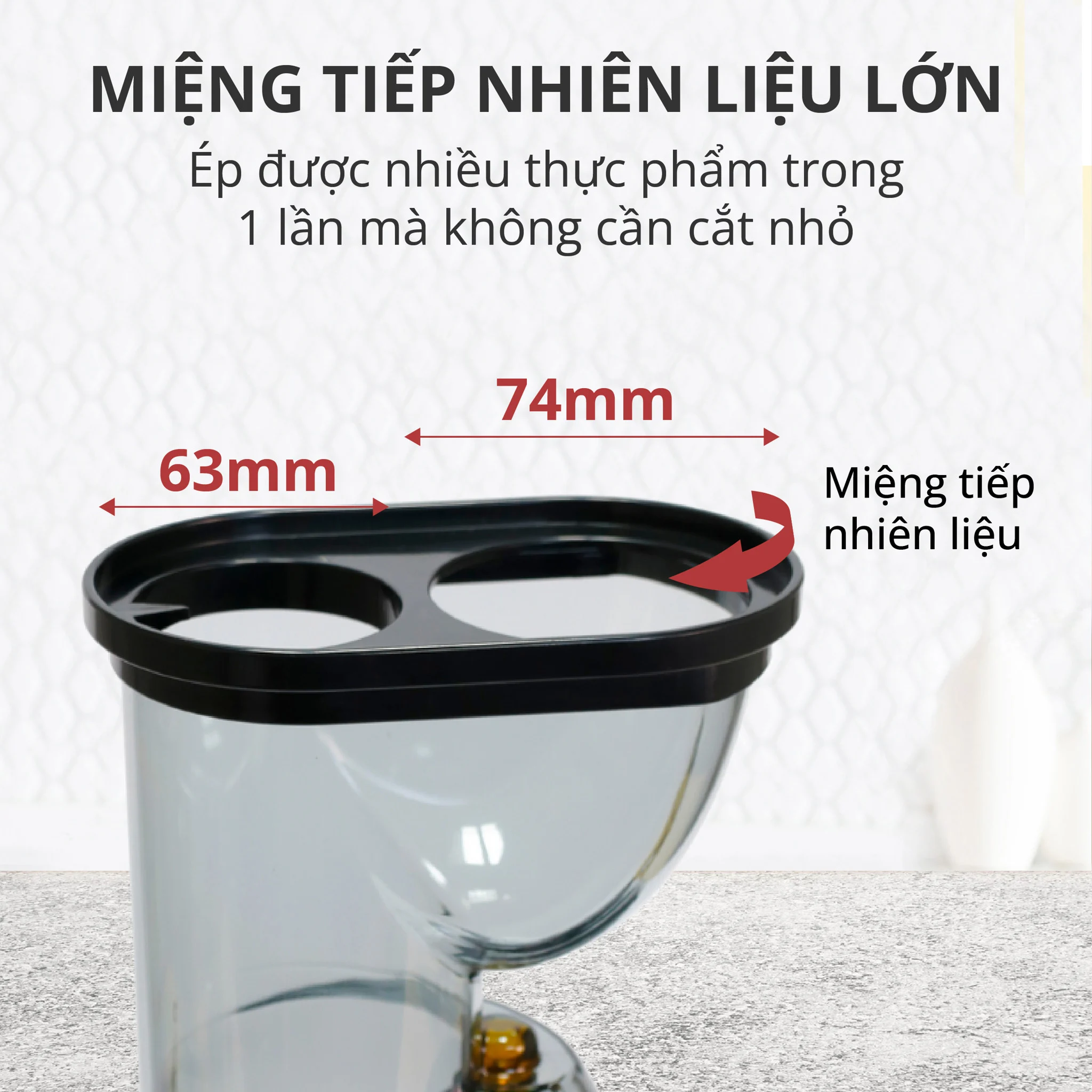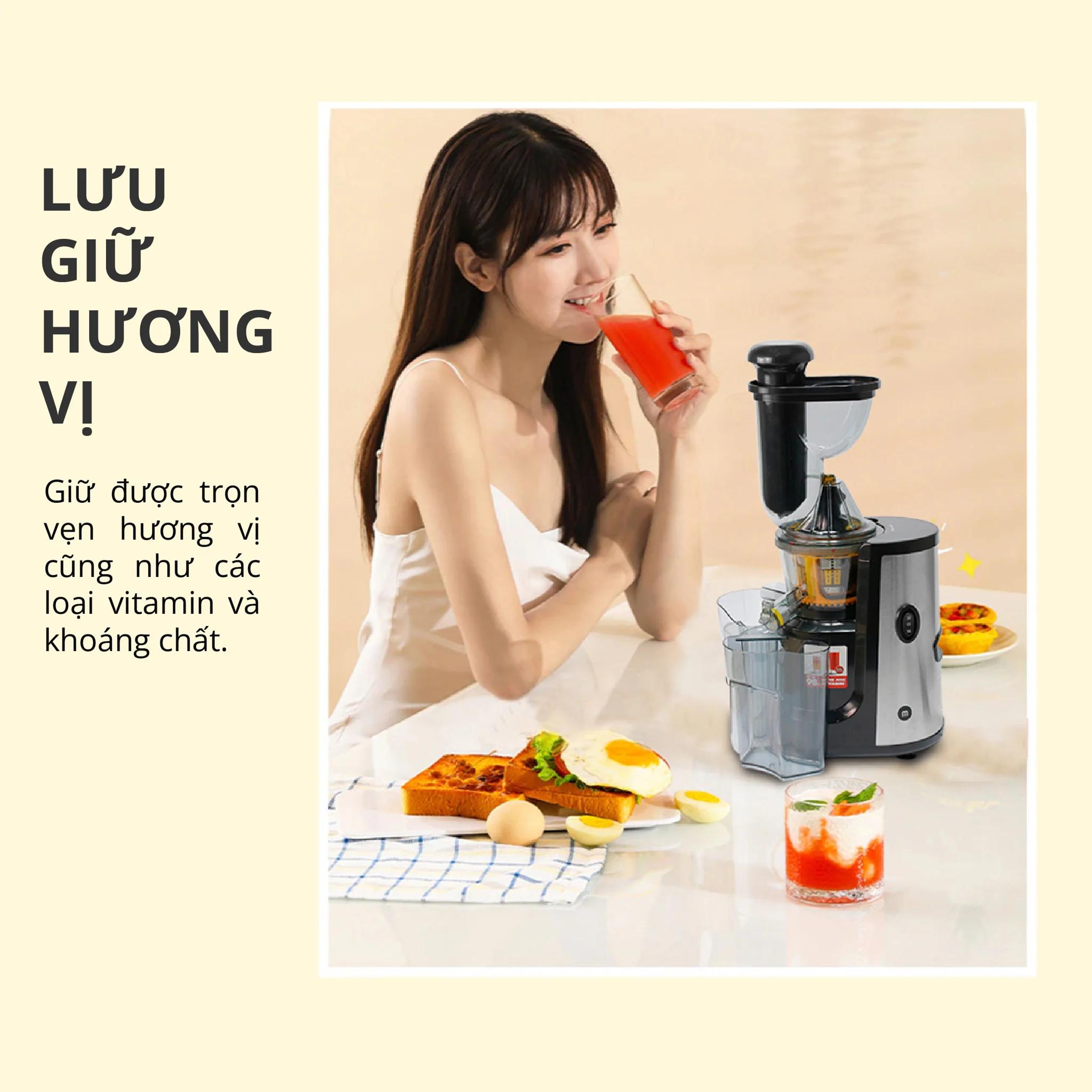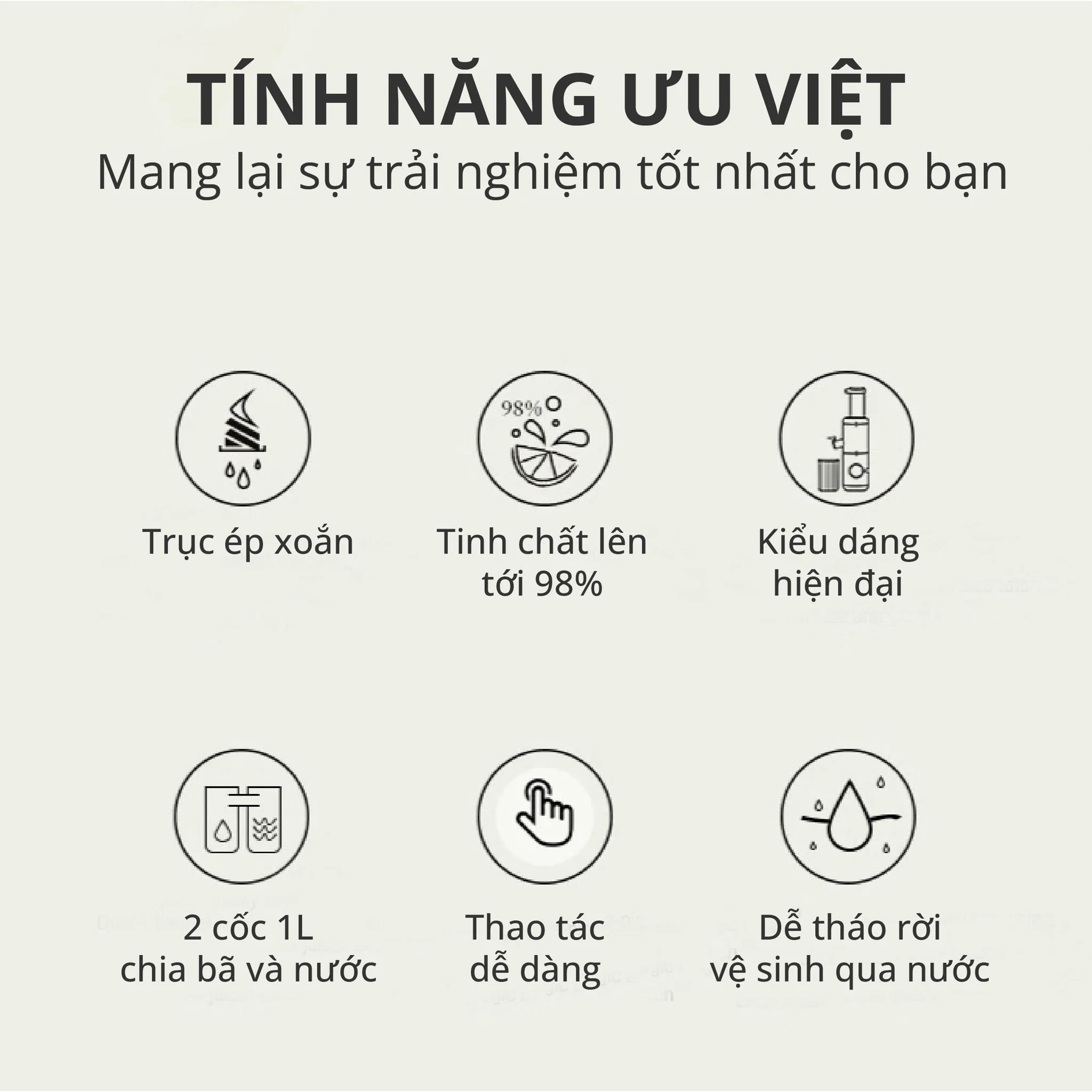 - 100% động cơ DC đồng, hoạt động êm ái - Ép kiệt bã tới 98%, cho nhiều nước ép và vitamin hơn - Điều khiển bằng 1 công tắc, dễ dàng vận hành máy - Chân đế bằng cao su chống trơn trượt - Không có BPA và có thể rửa bằng máy rửa chén - Khay chứa nước ép & khay chứa bã có dung tích 1L - Chức năng tách nước trái cây và bã, tiết kiệm thời gian và công sức - Dễ dàng tháo lắp & vệ sinh