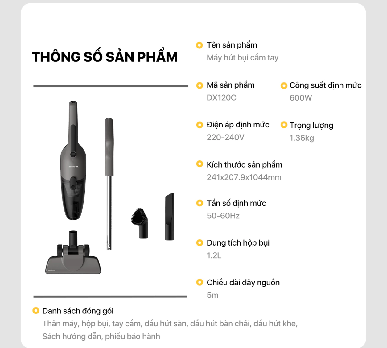 Thông số kỹ thuật Máy hút bụi Deerma DX120C lực hút 16Kpa, Công suất 600W động cơ không chổi than {New 2025} - Hàng chính hãng