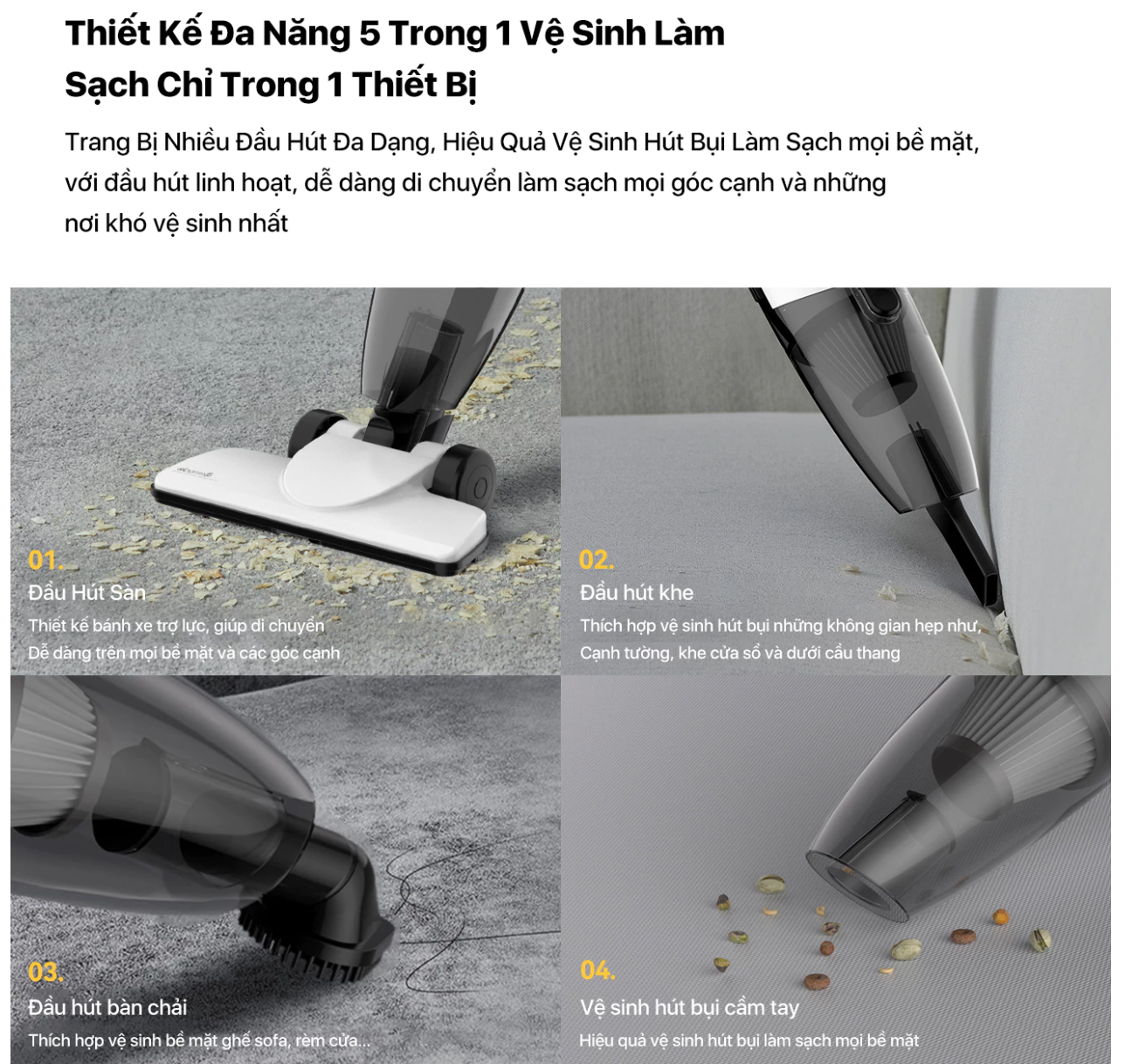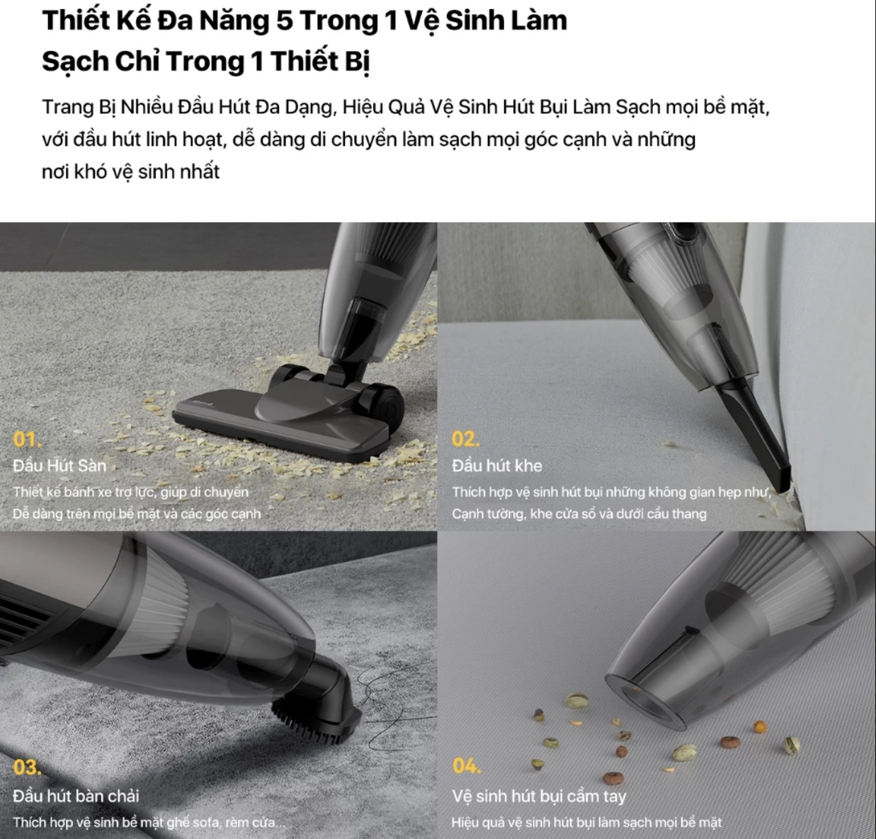 Trang bị 3 đầu hút riêng biệt phù hợp để vệ sinh nhiều khu vực khác nhau.
