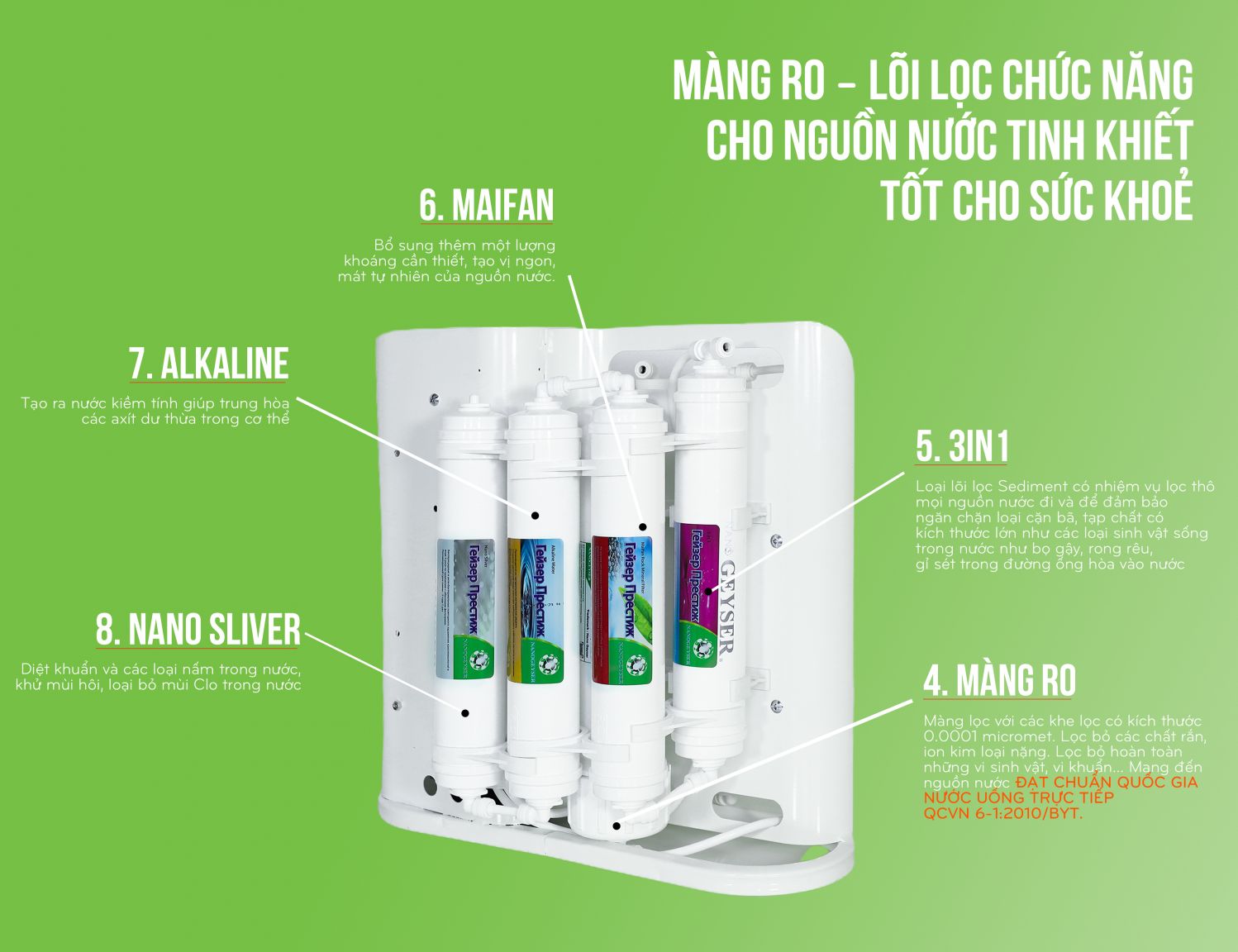 4. RO: Màng lọc với các khe lọc có kích thước 0.0001 micromet. Lọc bỏ các chất rắn, ion kim loại nặng. Lọc bỏ hoàn toàn những vi sinh vật, vi khuẩn… Mang đến nguồn nước ĐẠT CHUẨN QUỐC GIA NƯỚC UỐNG TRỰC TIẾP QCVN 6-1:2010/BYT. Thời gian thay thế: 24 tháng