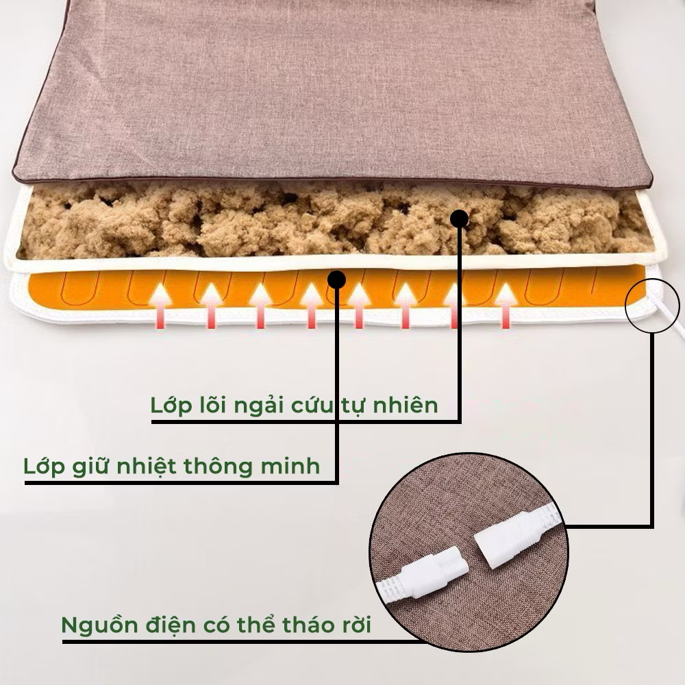Dùng điện cắm để làm nóng đệm và sử dụng, sức nóng kết hợp với ngải cứu mang lại hiệu quả thanh lọc cơ thể, thông kinh lạc, điều hòa khí huyết, làm chậm quá trình lão hóa và cải thiện sức khỏe.