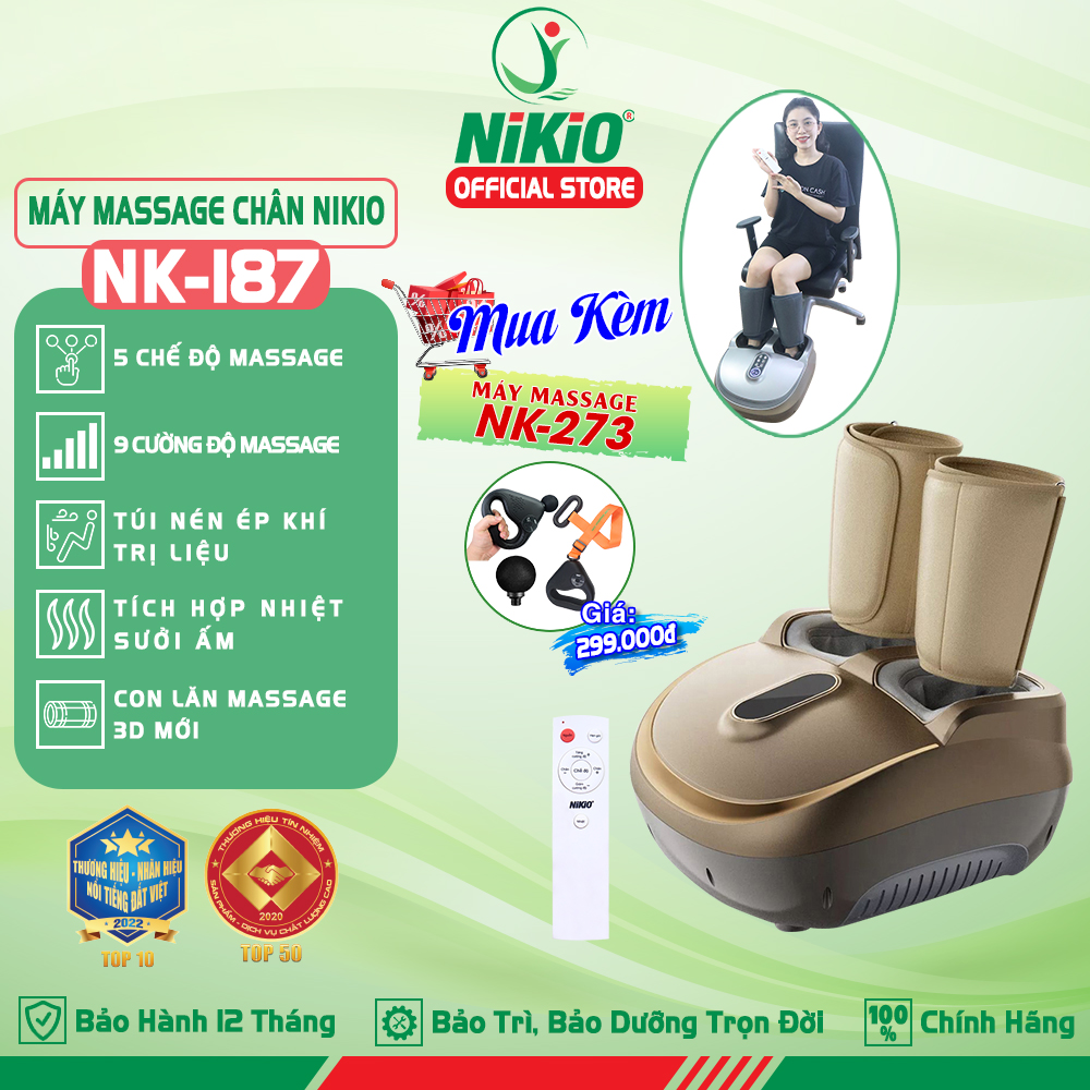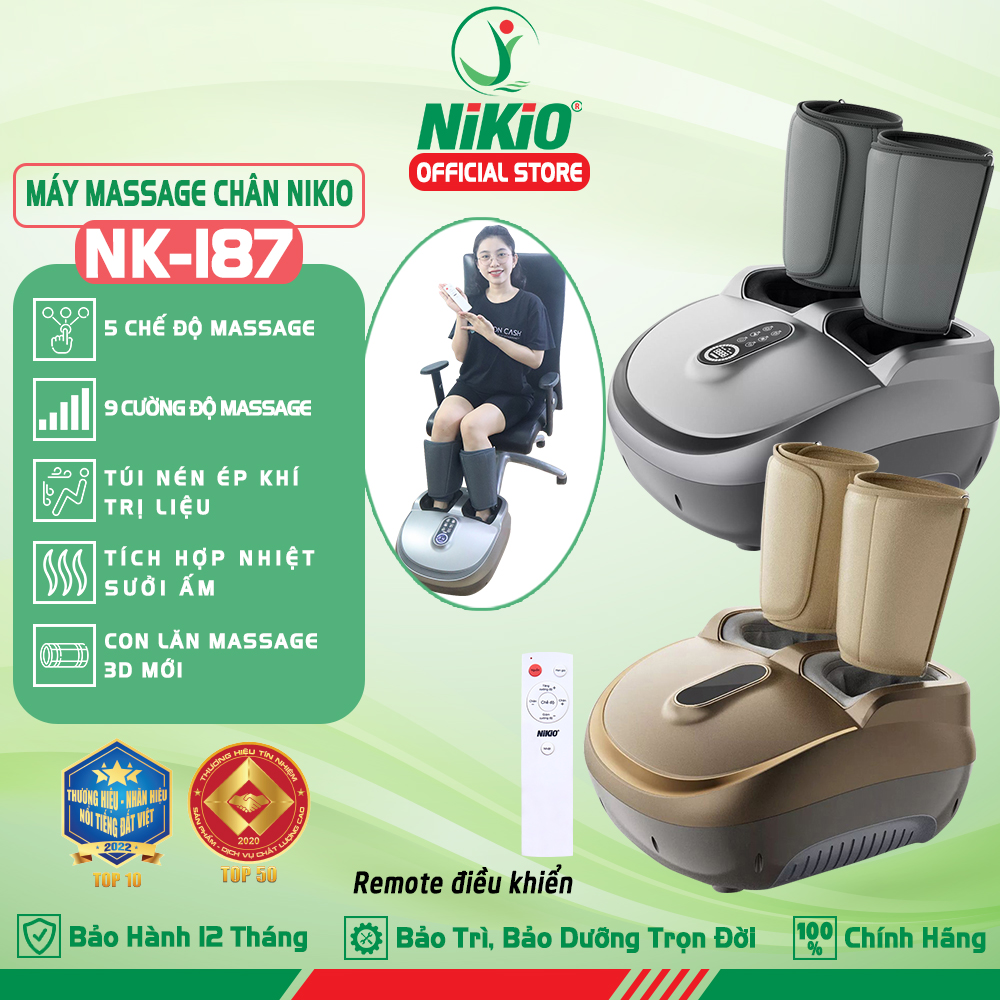 Máy massage chân và bắp chân áp suất khí Nikio NK-187 - 2in1, sản phẩm là sự kết hợp công nghệ xoa bóp dây ấn bằng bi co mu chân, lòng bàn chân và bóp áp suất khí nén bắp chân. Giúp cải thiện tuần hoàn máu cho chân, hỗ trợ cải thiện chứng suy giãn tĩnh mạch