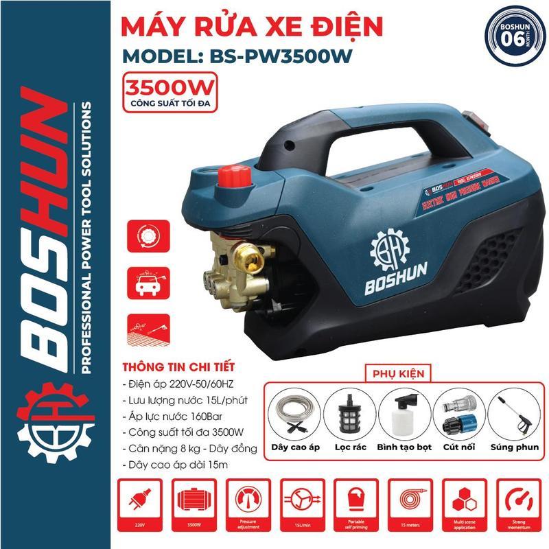 - Tên sản phẩm: Máy rửa xe chỉnh áp BOSHUN BS-PW3500W, Công suất 3500W, Dây Đồng, Dây Xịt Dài 15M